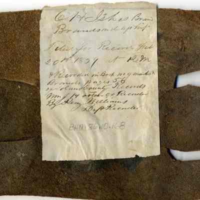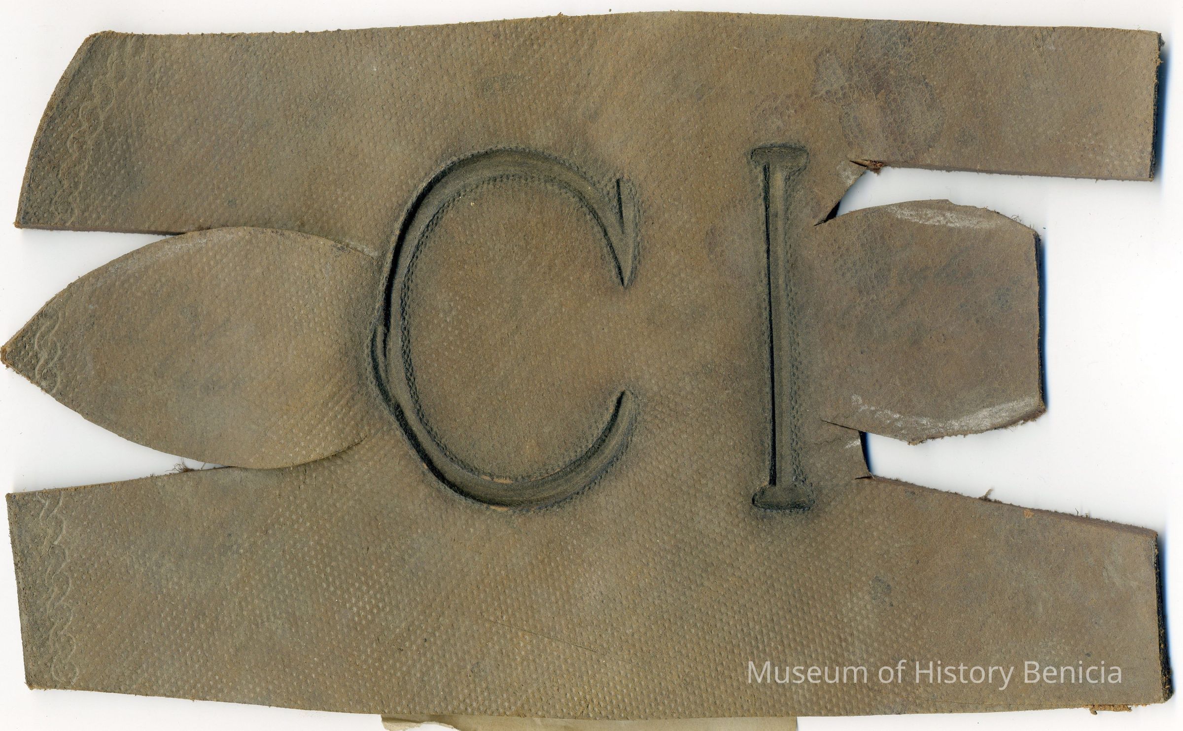 A partial copy of the original recording is adhered to the back of the leather. The brand is "C I" and is placed on the left hip. the earmarkings are cut into the sides of the rectangle.Collection