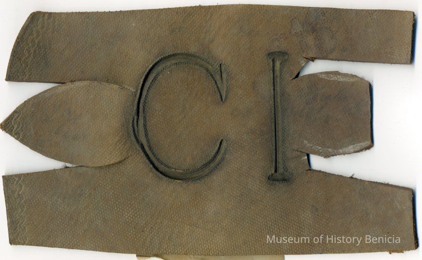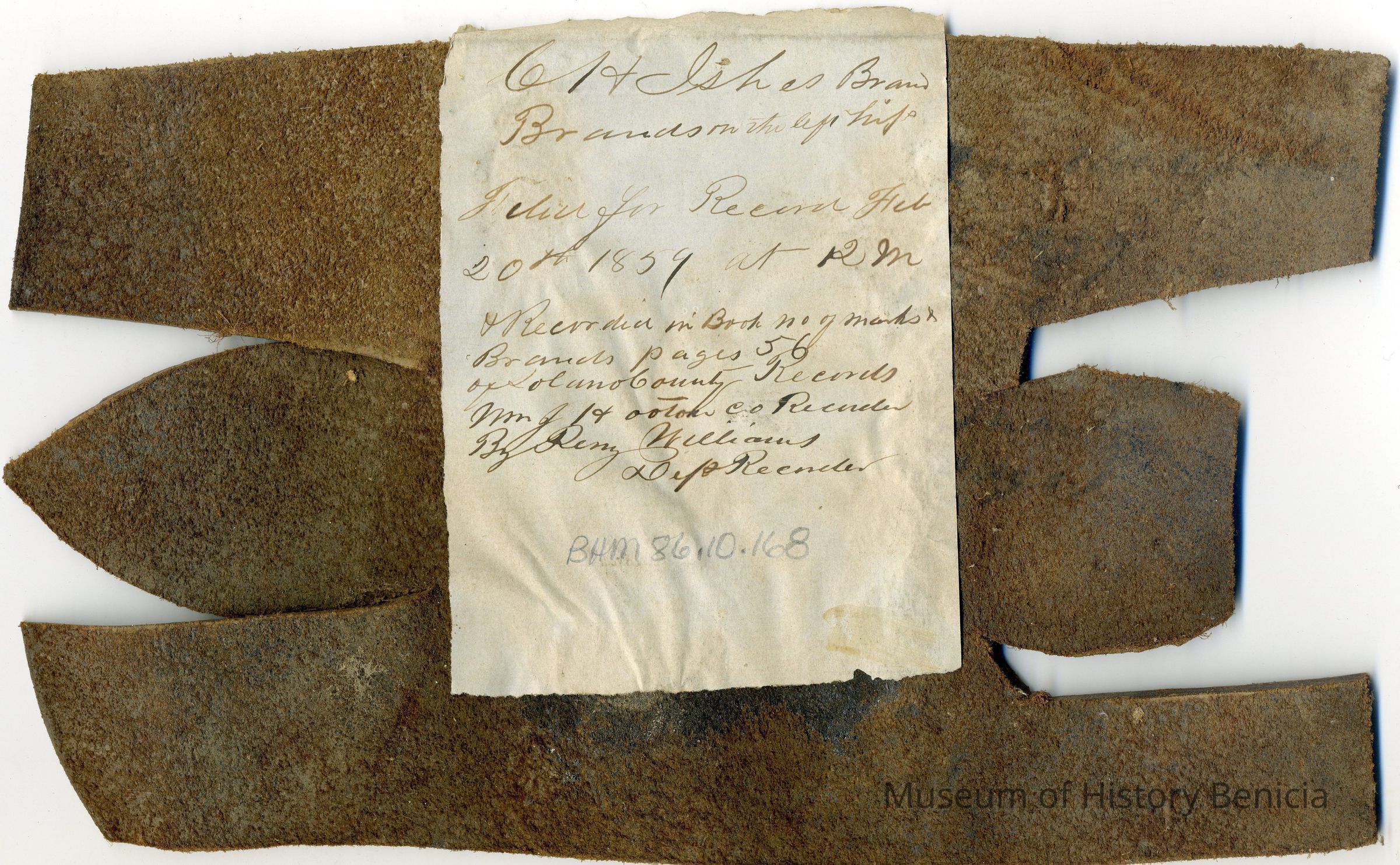 Sample brand/earmarkings on a piece of leather for C.H. Ishe, registered on February 20, 1859, as written in a Ledger of the Solano County Recorder 1855-1916. (page 56)