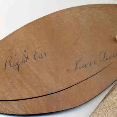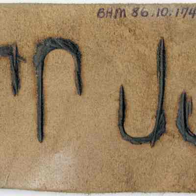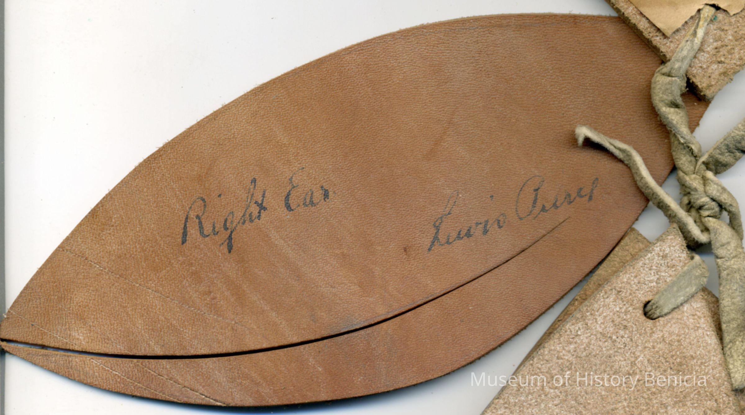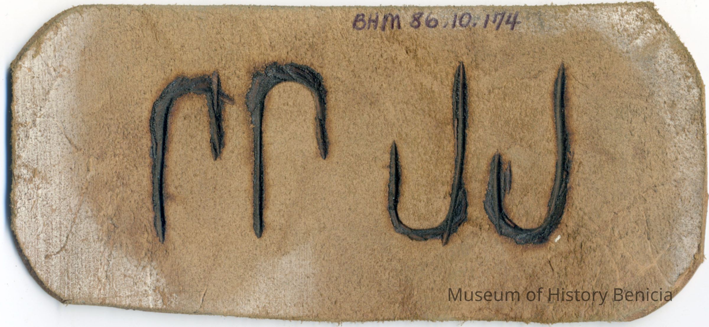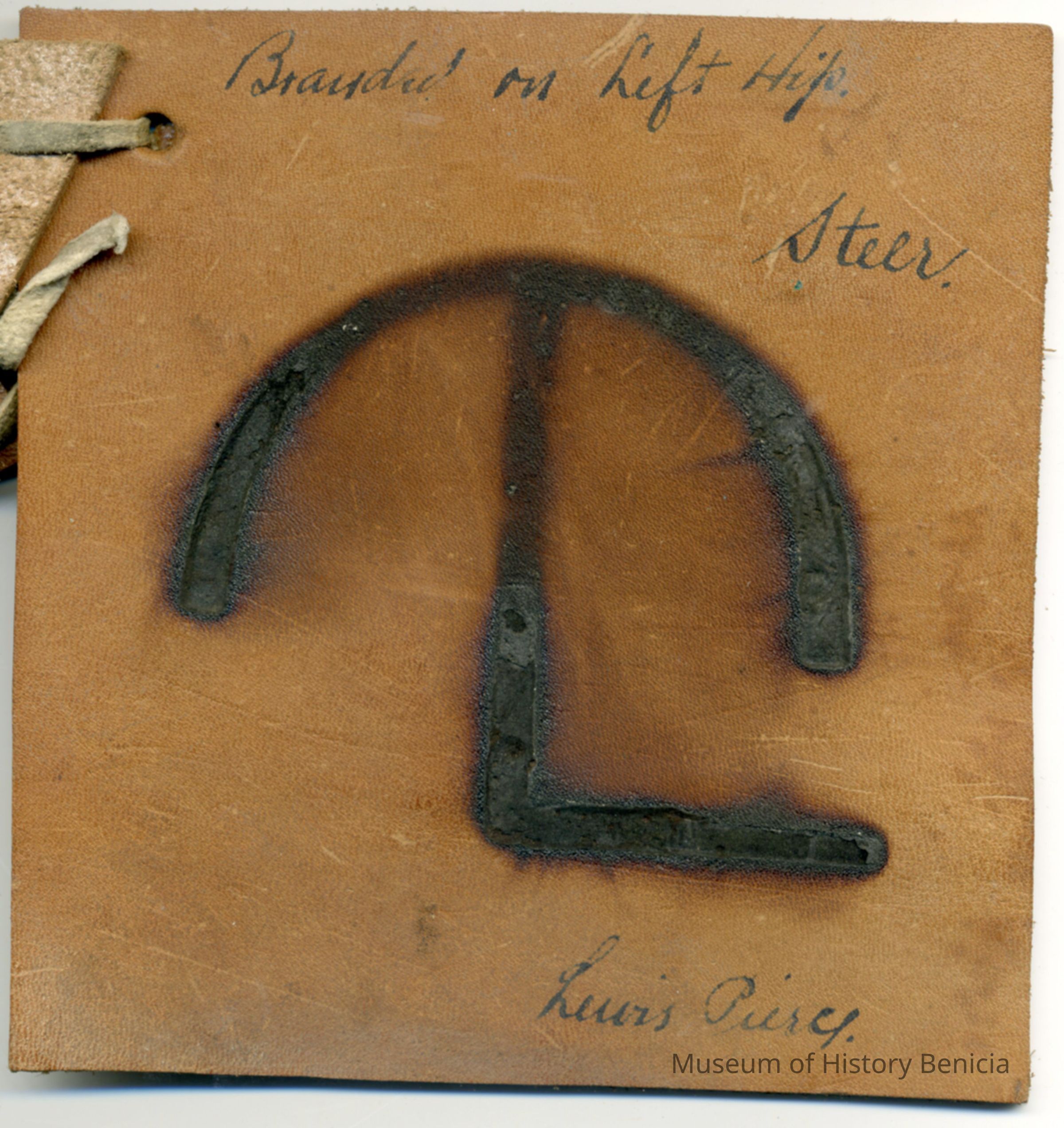 Sample brands/earmarkings on 4 pieces of leather tied together with a rawhide lace, for Lewis Pierce, registered on May 3, 1910, as written in a Ledger of the Solano County Recorder 1855-1916. (page 120)