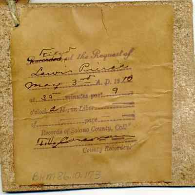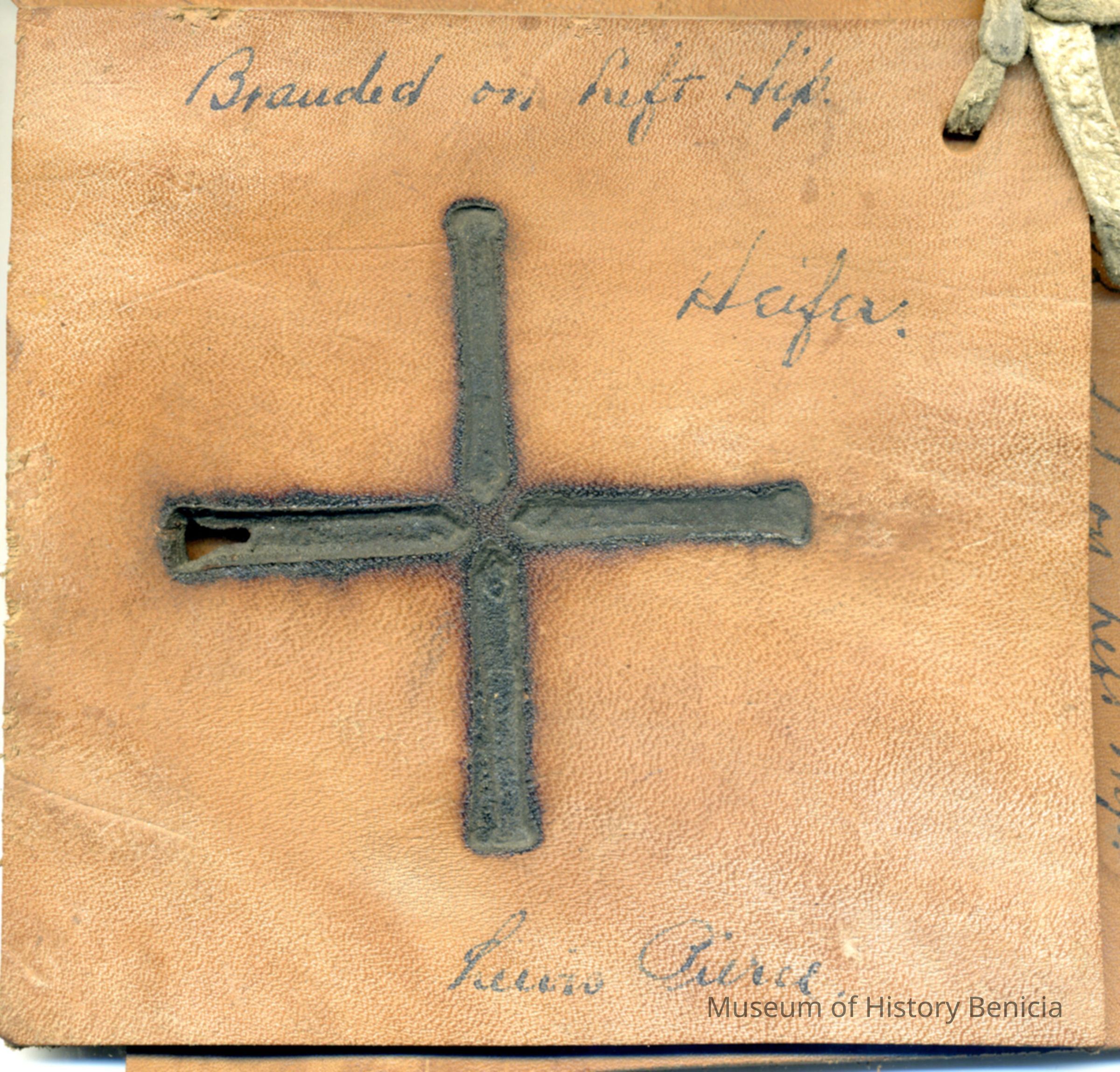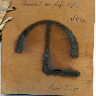 A partial copy of the original recording is adhered to the back of one of the pieces of the leather. One brand is a sideways capital "C" on top of a capital "L" and placed on the left hip of the steers. The other brand is an "X" and placed on the left hip of the heifers.Collection