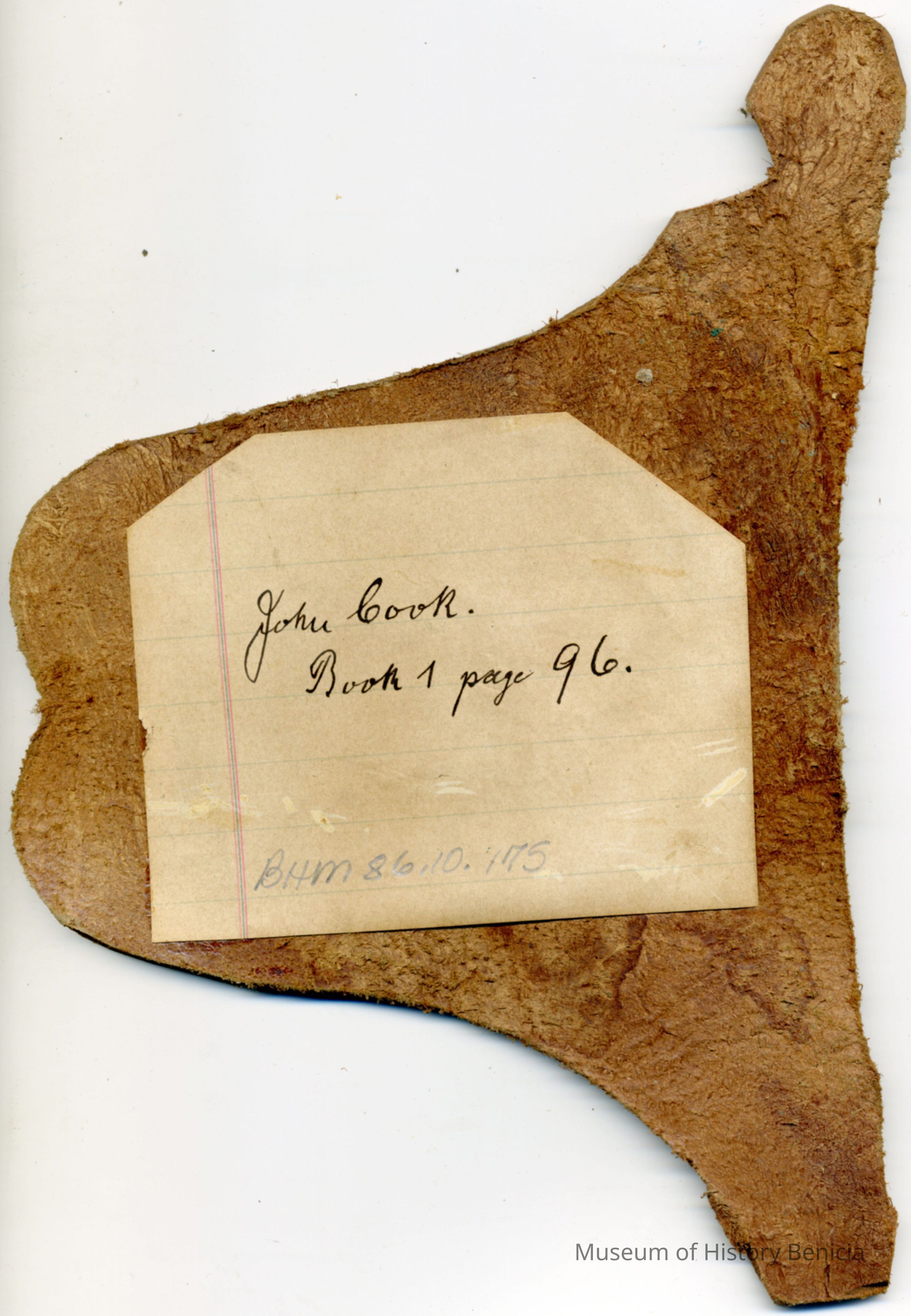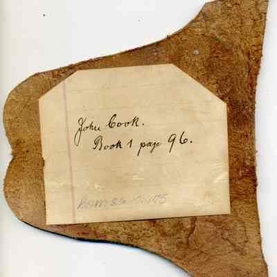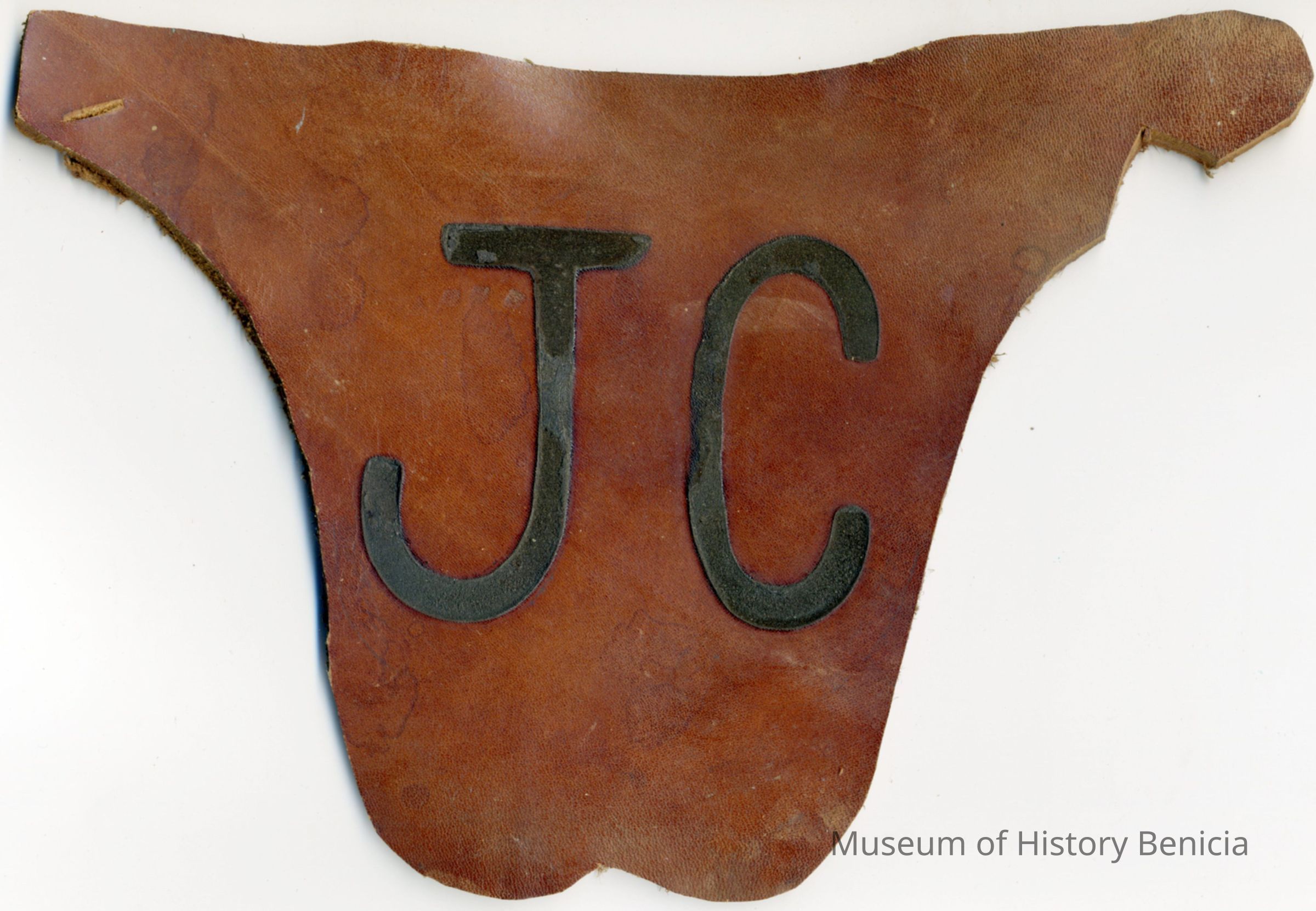 The paper adhered to the back of the piece of leather lists only the individual's name and Book 1 page 96. The brand is "J C" and placed on the left hip.Collection