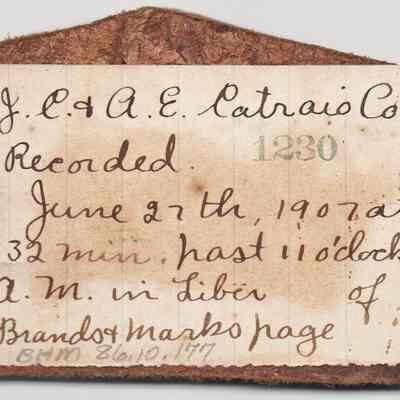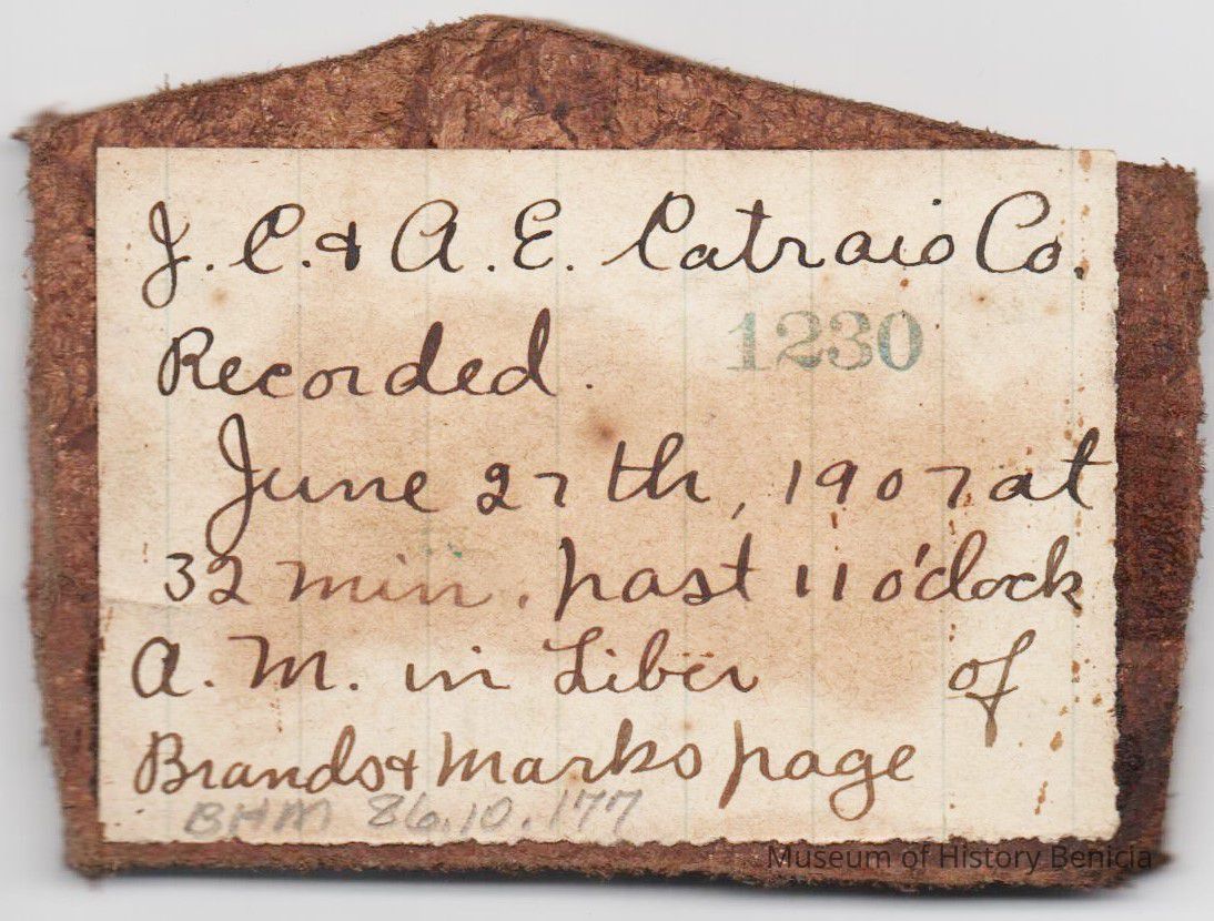 Sample brand on a piece of leather for J.C. & A.E. Catraio Co., registered on June 27, 1907, as written in a Ledger of the Solano County Recorder 1855-1916. (page 116)