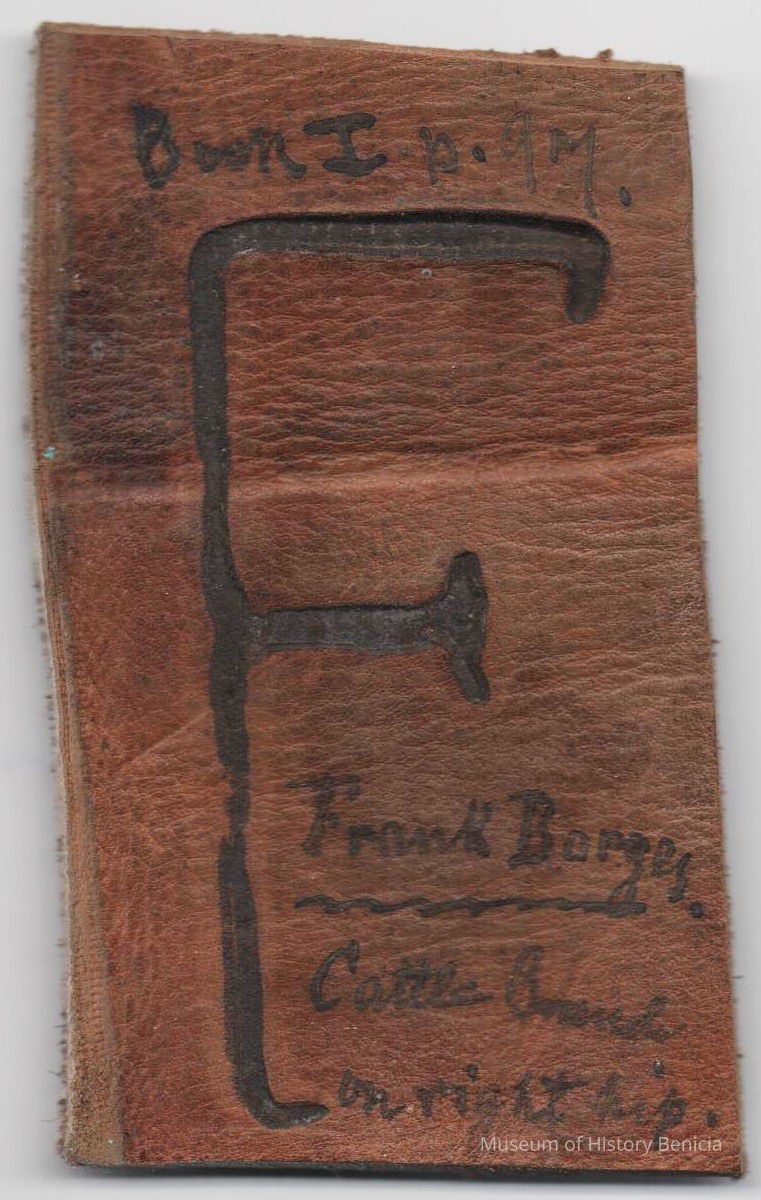 No copy of the original recording is adhered to the back of the piece of leather, however, some information is written in ink on the front of the piece. The brand is "F" and placed on the right hip.Collection