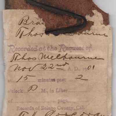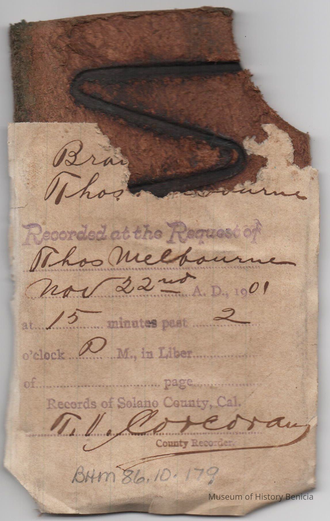 Sample brand on a piece of leather for Thomas Melbourne, registered on November 22, 1901, as written in a Ledger of the Solano County Recorder 1855-1916. (page 110)
