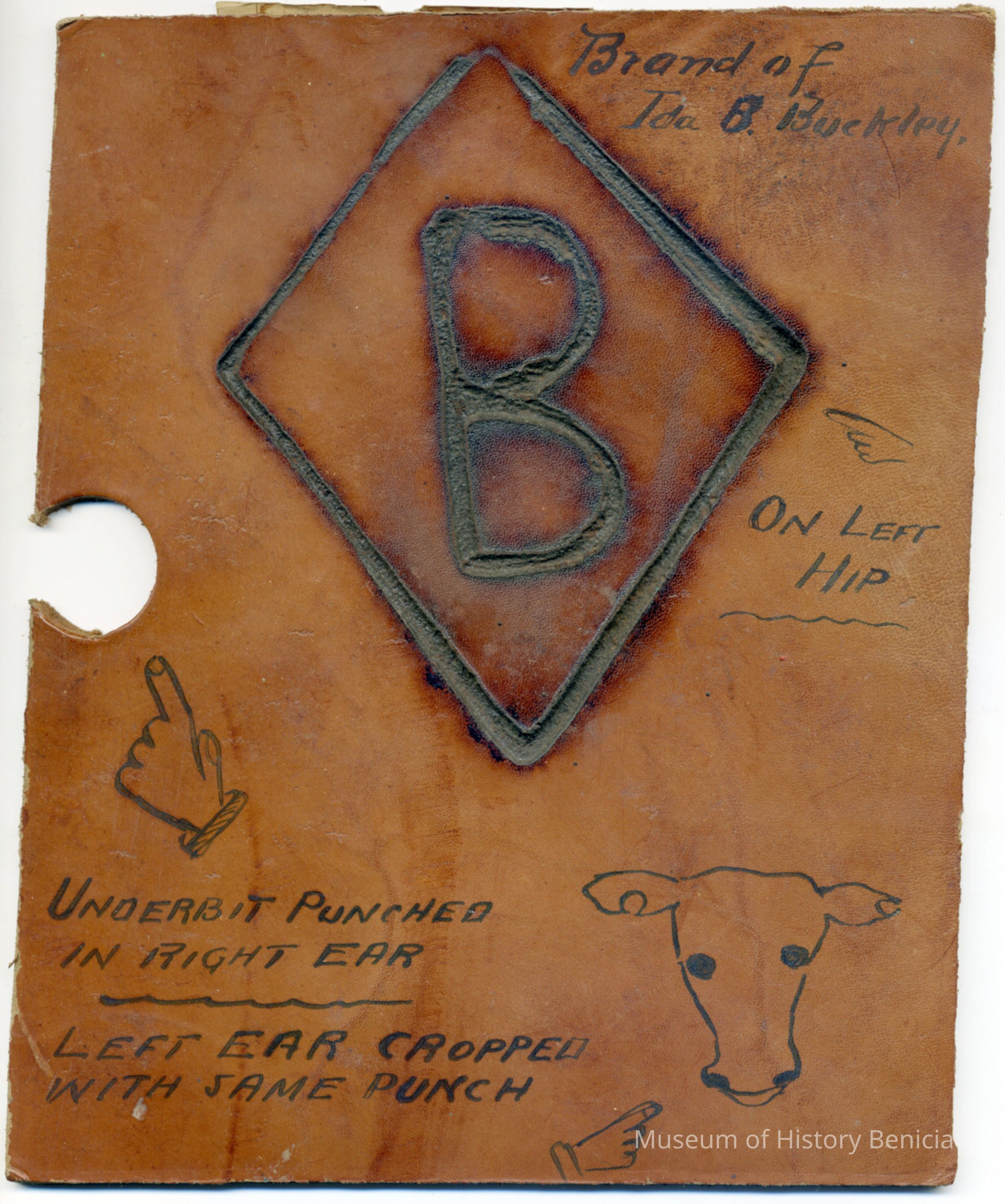 Sample brand/earmarking on a piece of leather for Ida B. Buckley, registered on March 31, 1905, as written in a Ledger of the Solano County Recorder 1855-1916. (page 113)
