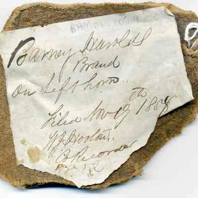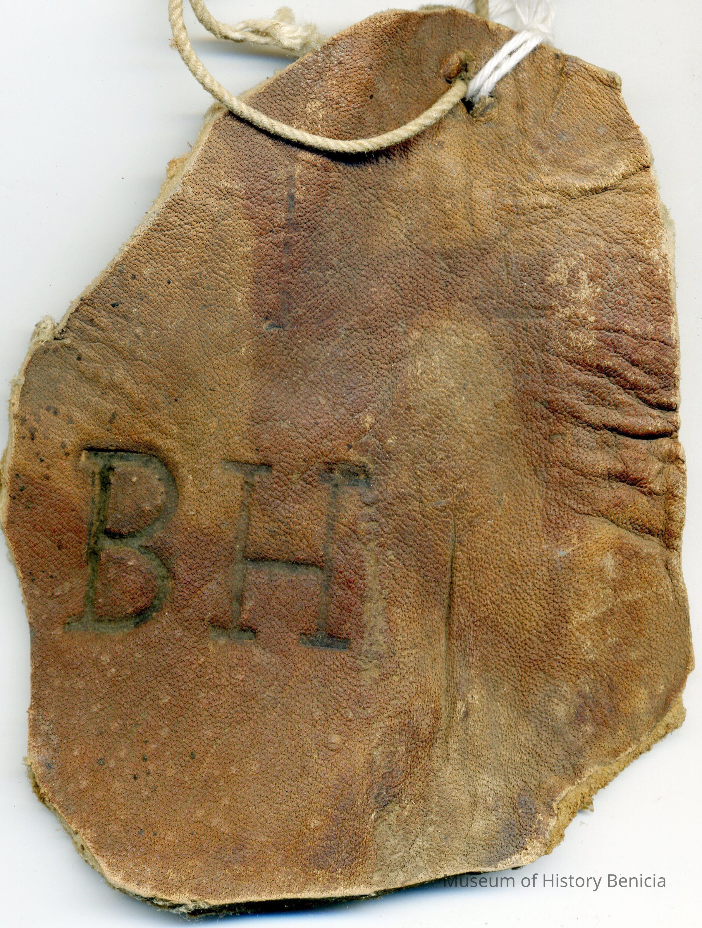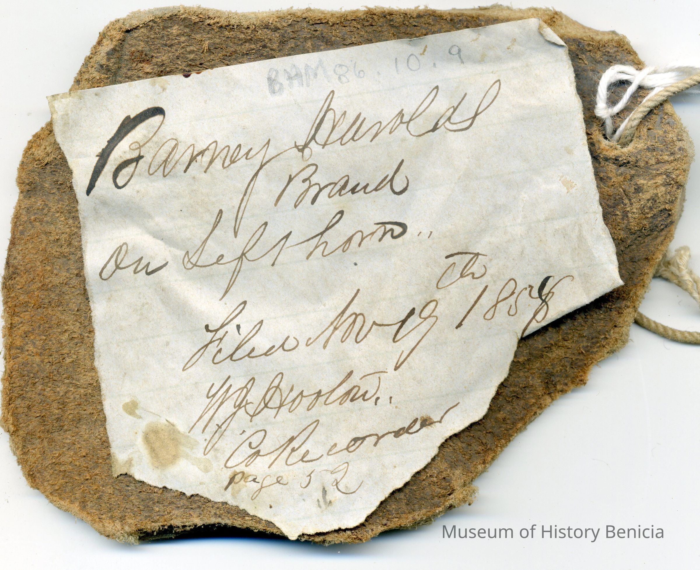 A copy of the recording is adhered to the back of the leather. The brand is "BH" on left horn.