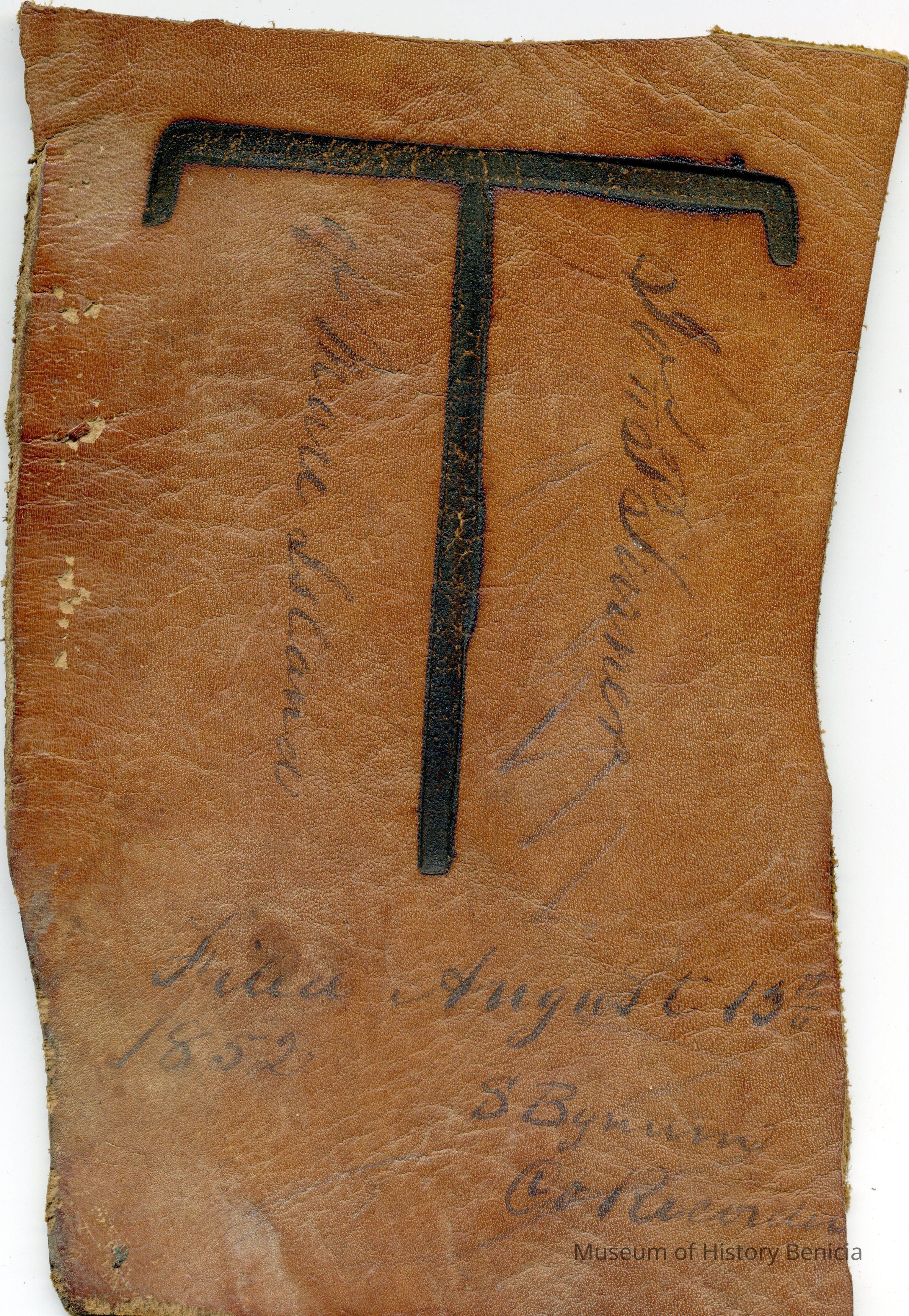 No copy of a recording is adhered to the leather. Information is handwritten in ink on the front of the leather: "Jos. P Turner of Mare Island, Filed August 15th 1852 (signed) S. Bynum Co. Recorder" The brand is "T" but the placement is unknown.Collection