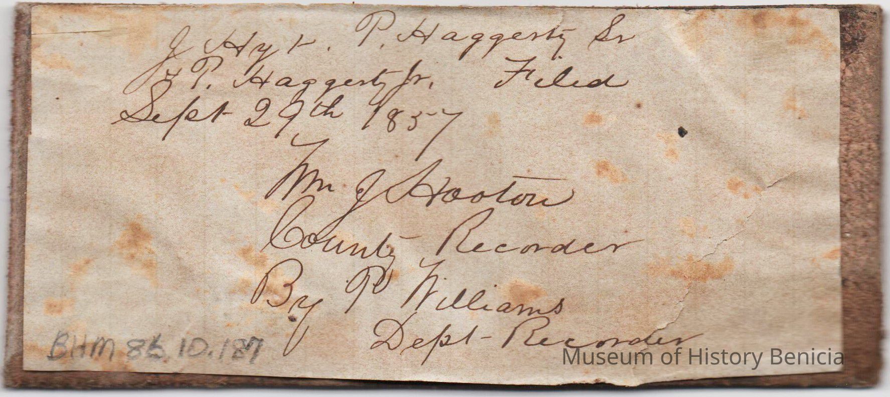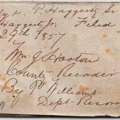 Sample brand on a piece of leather for J. Hoyt, P Haggerty Sr., & P. Haggerty Jr., registered on September 29, 1857, as written in a Ledger of the Solano County Recorder 1855-1916. (page 26)