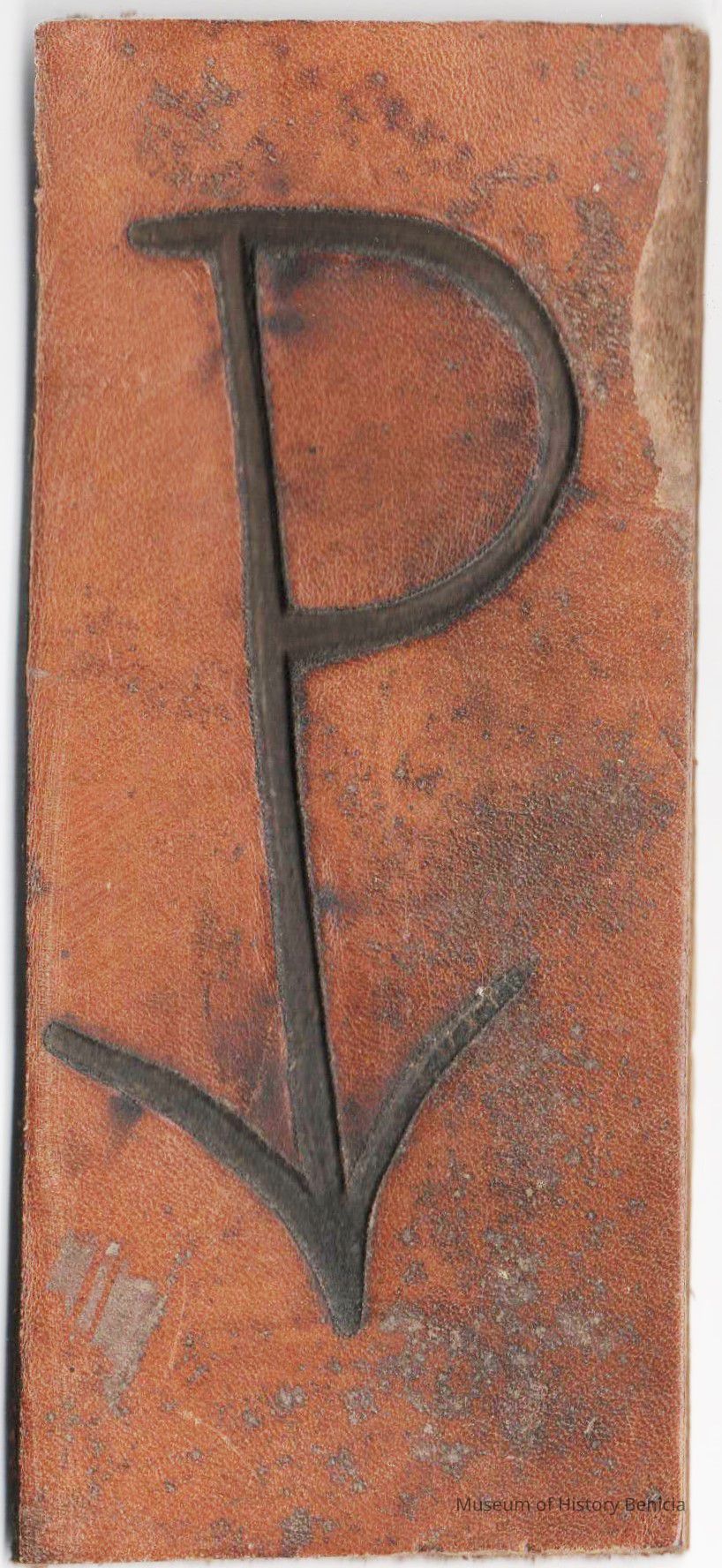 A partial copy of the original recording is adhered to the back of the piece of leather. The brand is a capital "P" with a downward arrow on the P's upright. No placement is noted.Collection