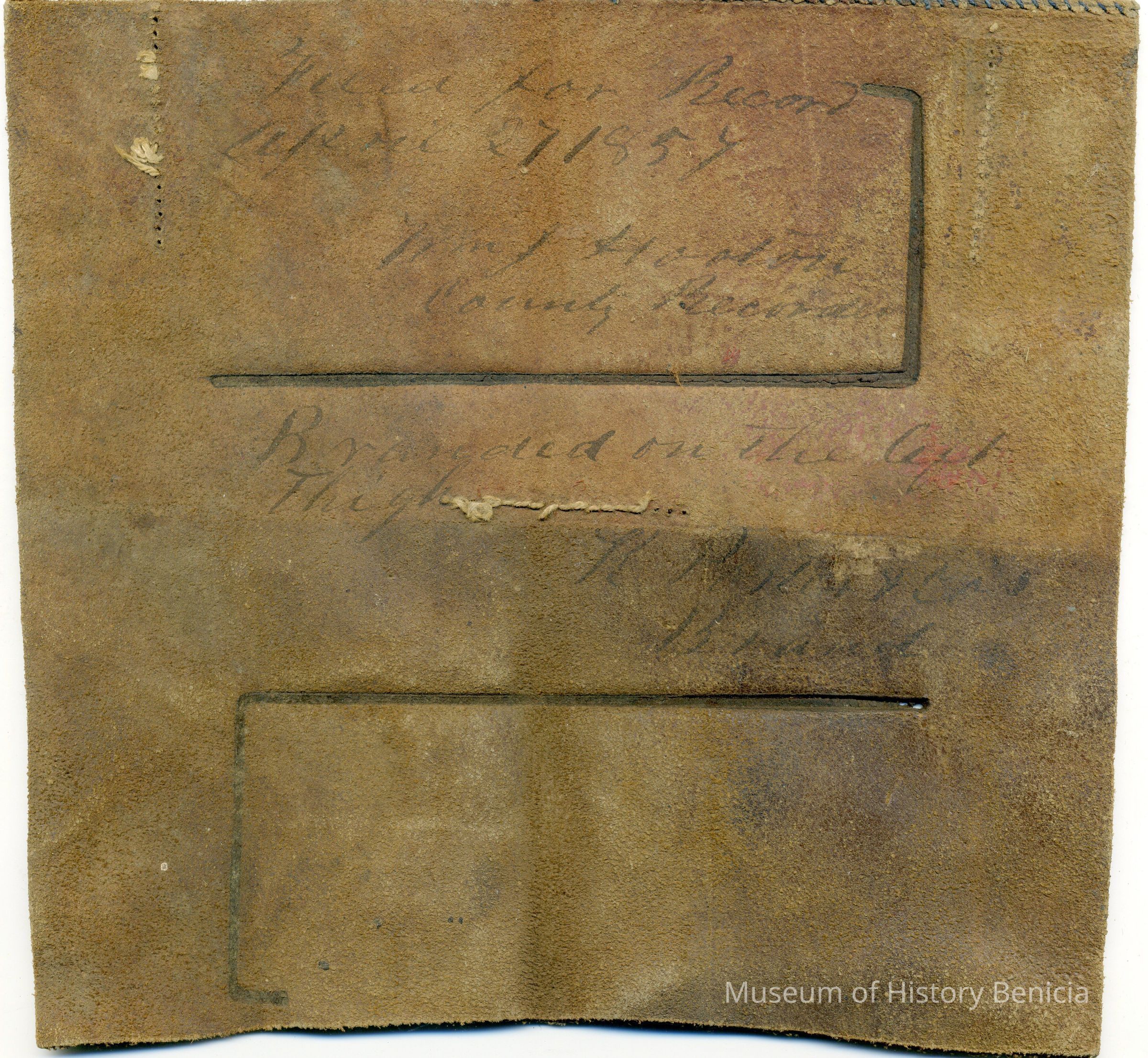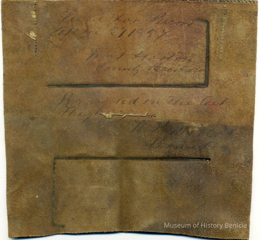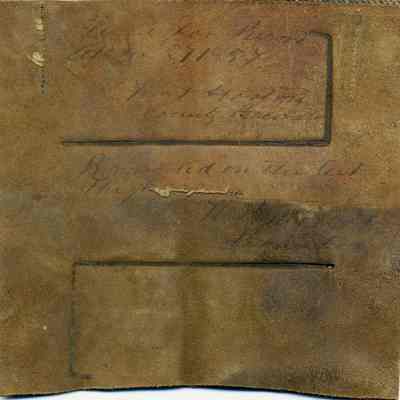 No copy of the recording is adhered to the back of the leather. There is information hand written on the front of the leather piece. The brand is "7 L" on the left thigh.Collection
