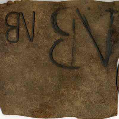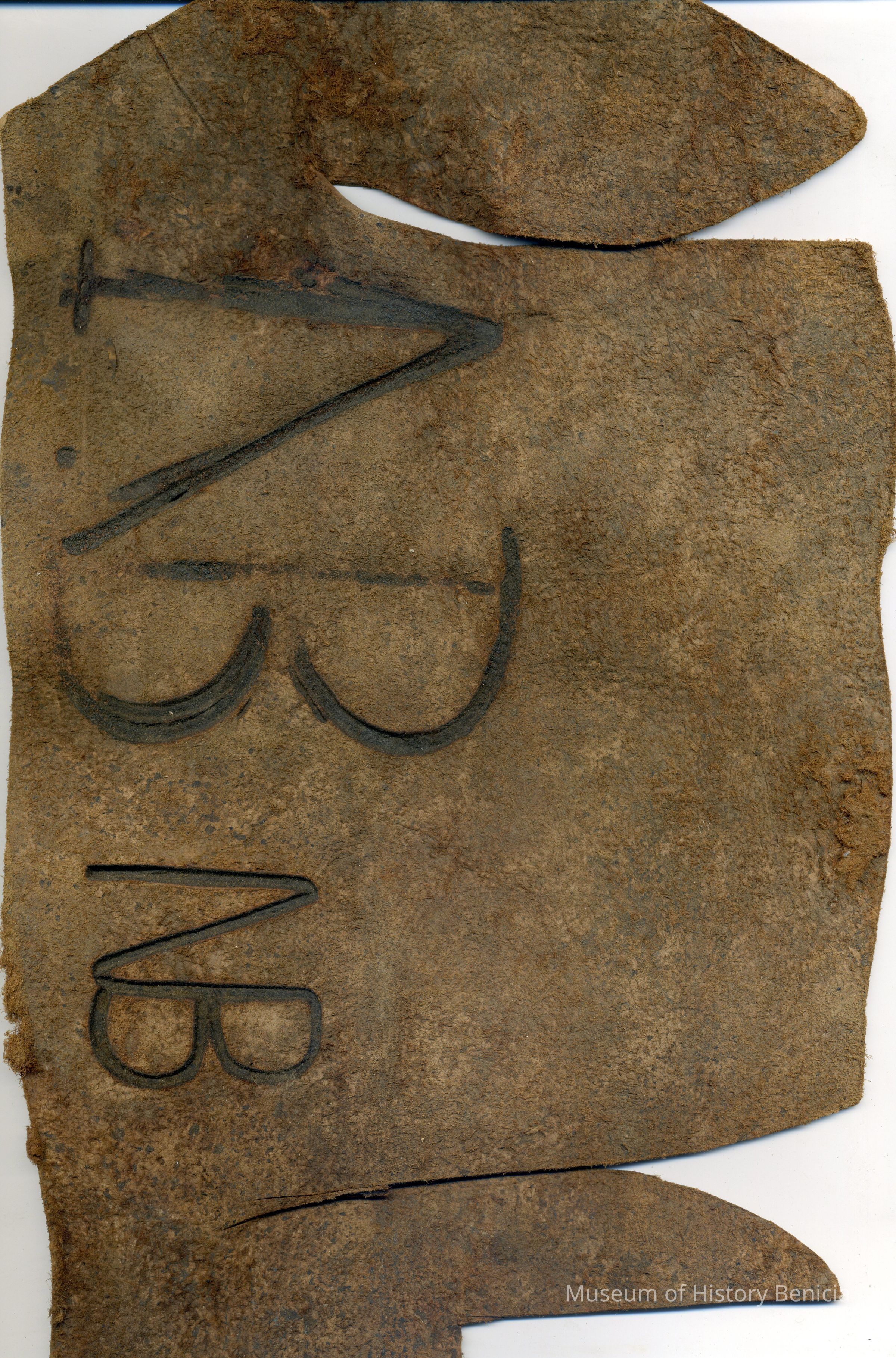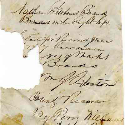 A copy of the recording was adhered to the back of the leather but has become unattached. The leather includes ear markings/cuts. The brand is an "N" and a "B" connected and branded on right hip.Collection