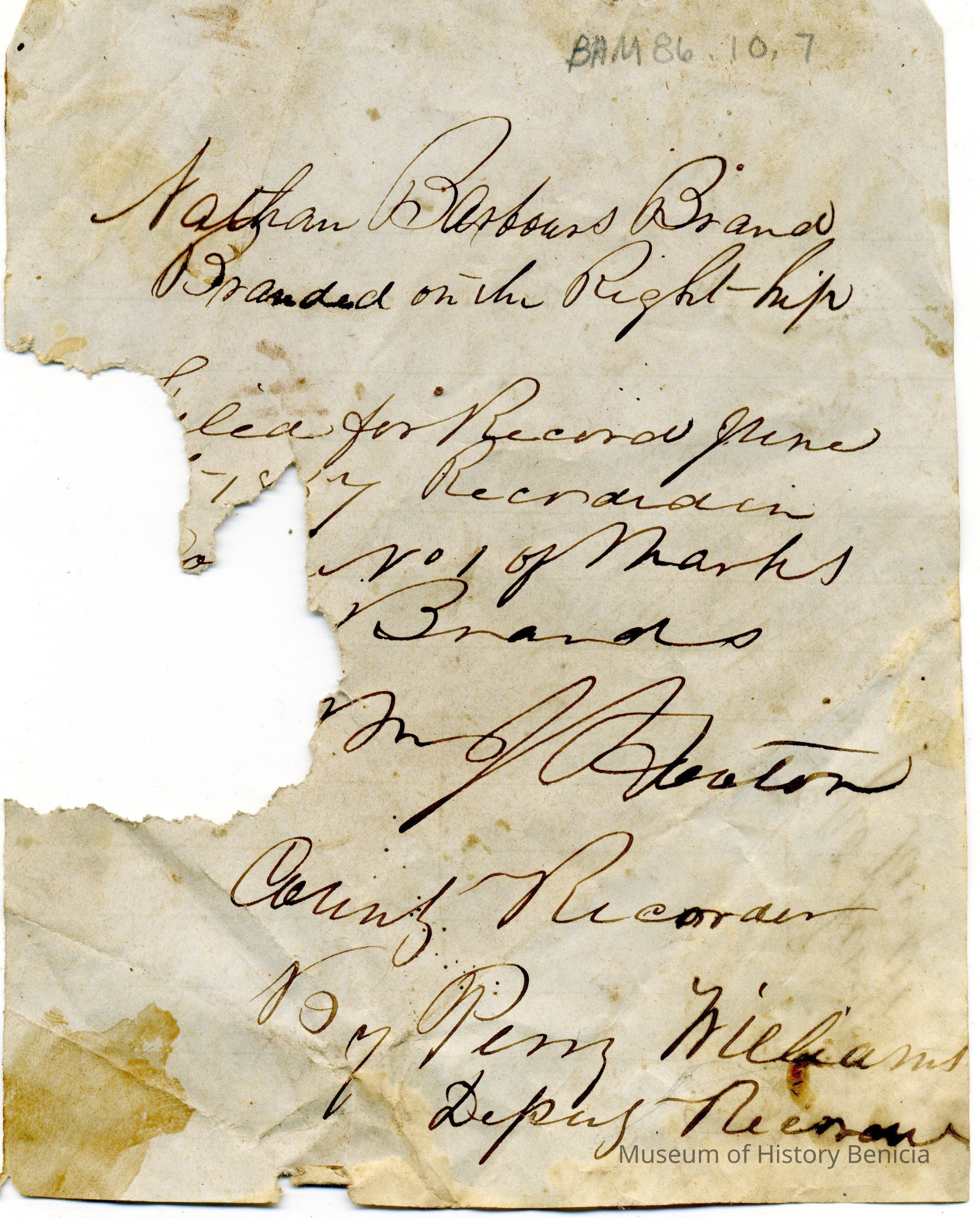 Sample brand stamped on leather for Nathan Barbour, a true copy of the original filed June 1, 1857, as written in a Ledger of the Solano County Recorder 1855-1916 (page17)