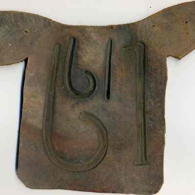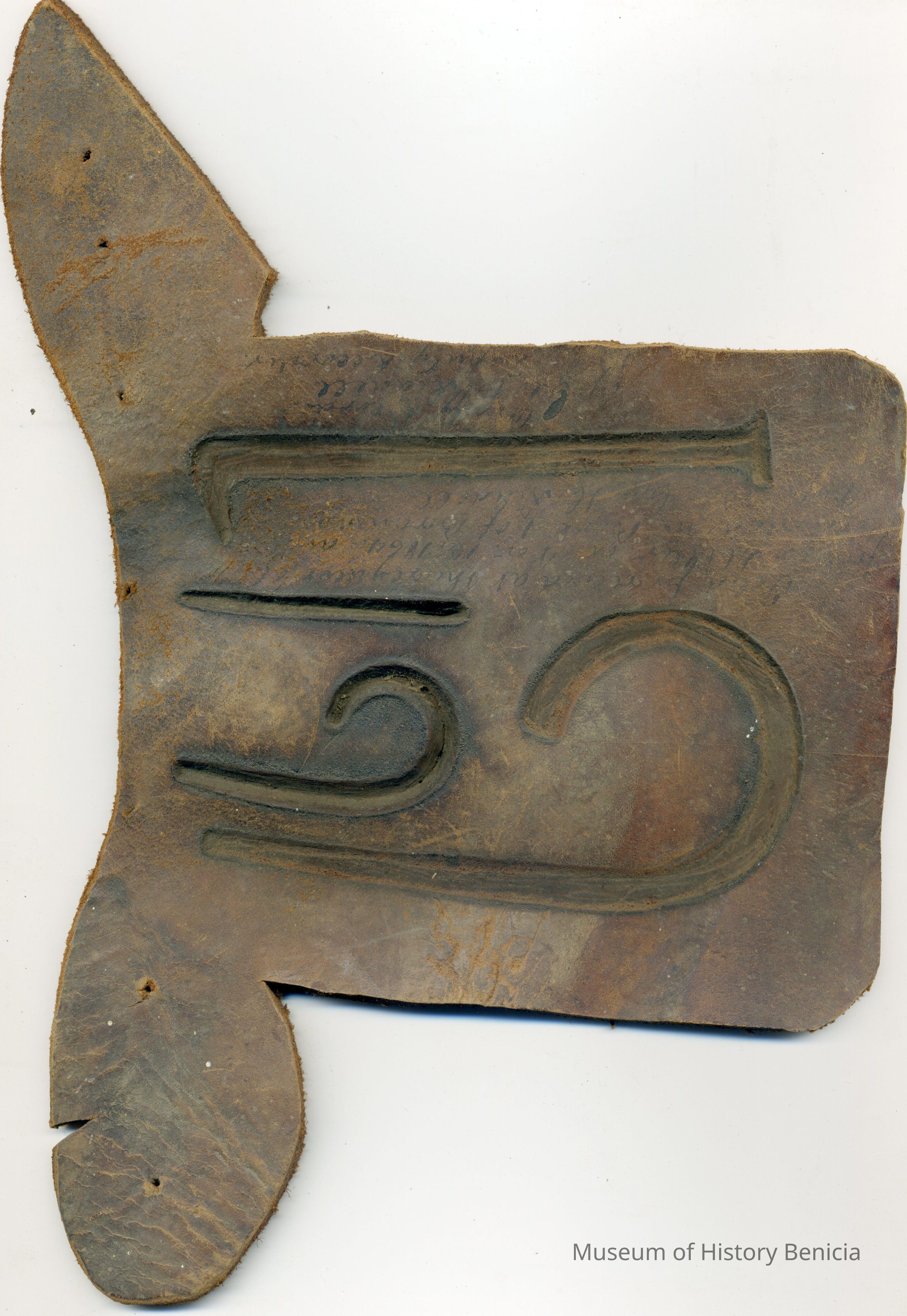 No copy of the recording is adhered to the back of the leather. Ear markings are cut into the leather piece. The brand is "6 1" on the left hip.Collection