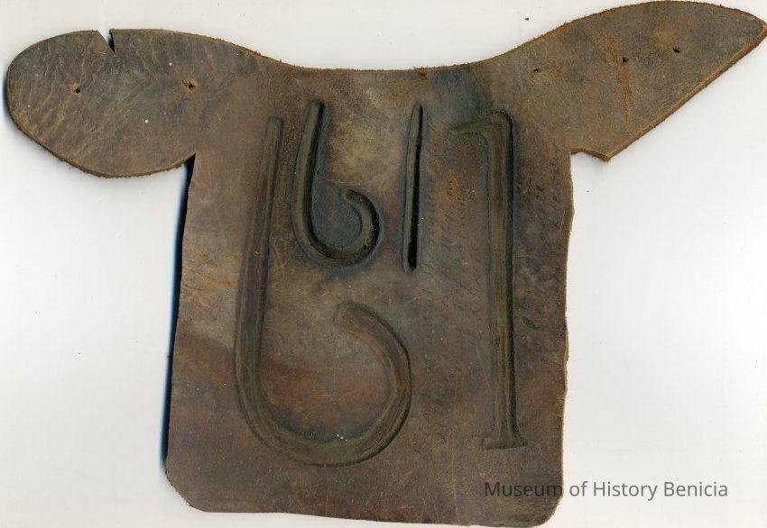 Sample brand stamped on leather for James Miller, a true copy of the original filed November 12, 1864, as written in a Ledger of the Solano County Recorder 1855-1916 (page73)