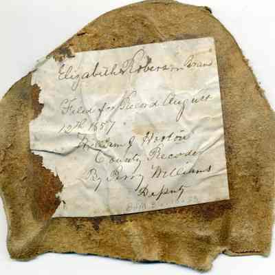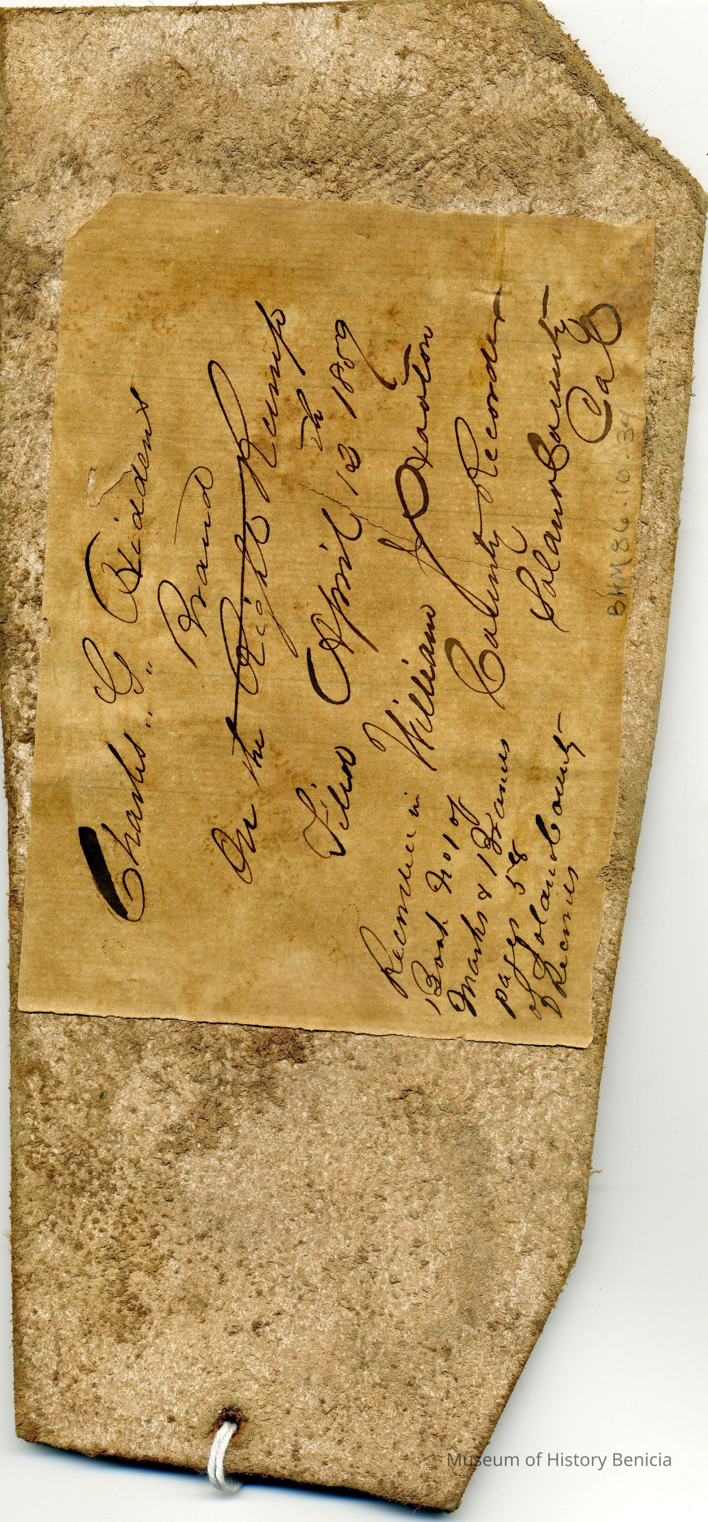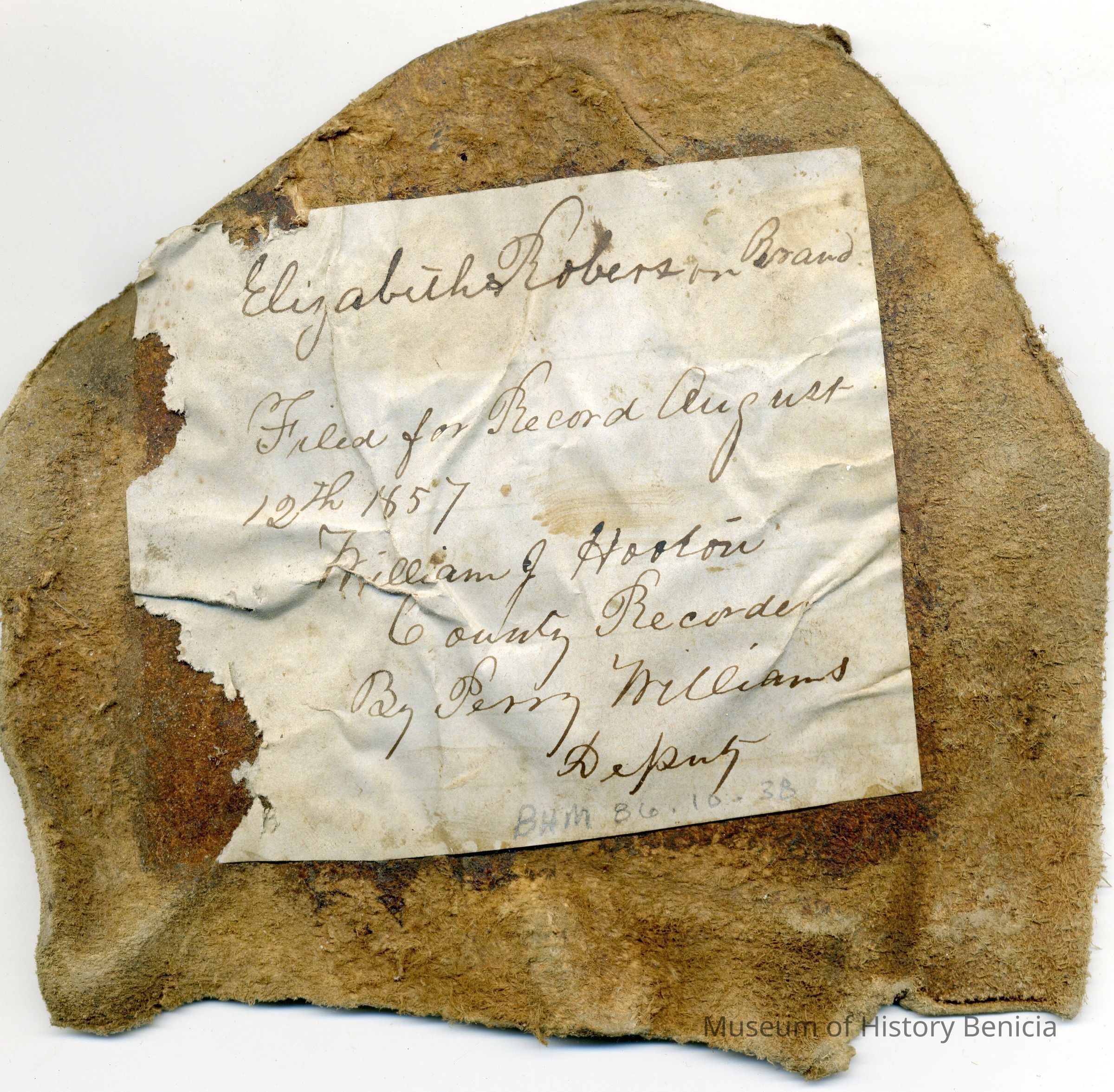 Sample brand on a piece of leather for Elizabeth Robertson, a true copy of the original filed August 12, 1857, is recorded in a Ledger of the Solano County Recorder 1855-1916. (page 21)