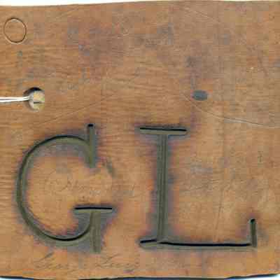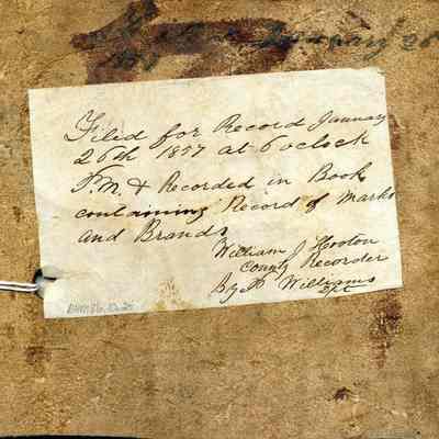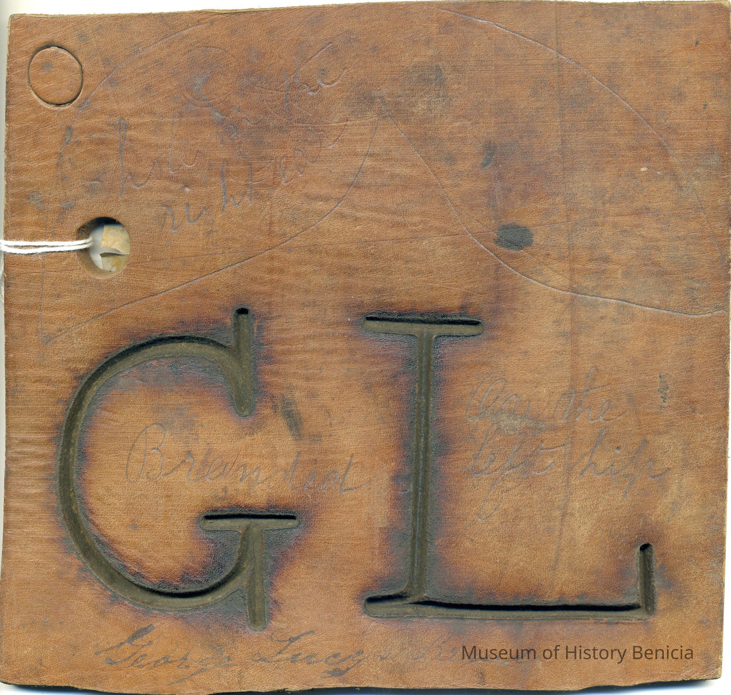 A copy of the recording is adhered to the back of the leather. The ear marking is punched in the leather and there is also some writing in ink on the front of the piece of leather. The brand is "G L" on the left hip.Collection