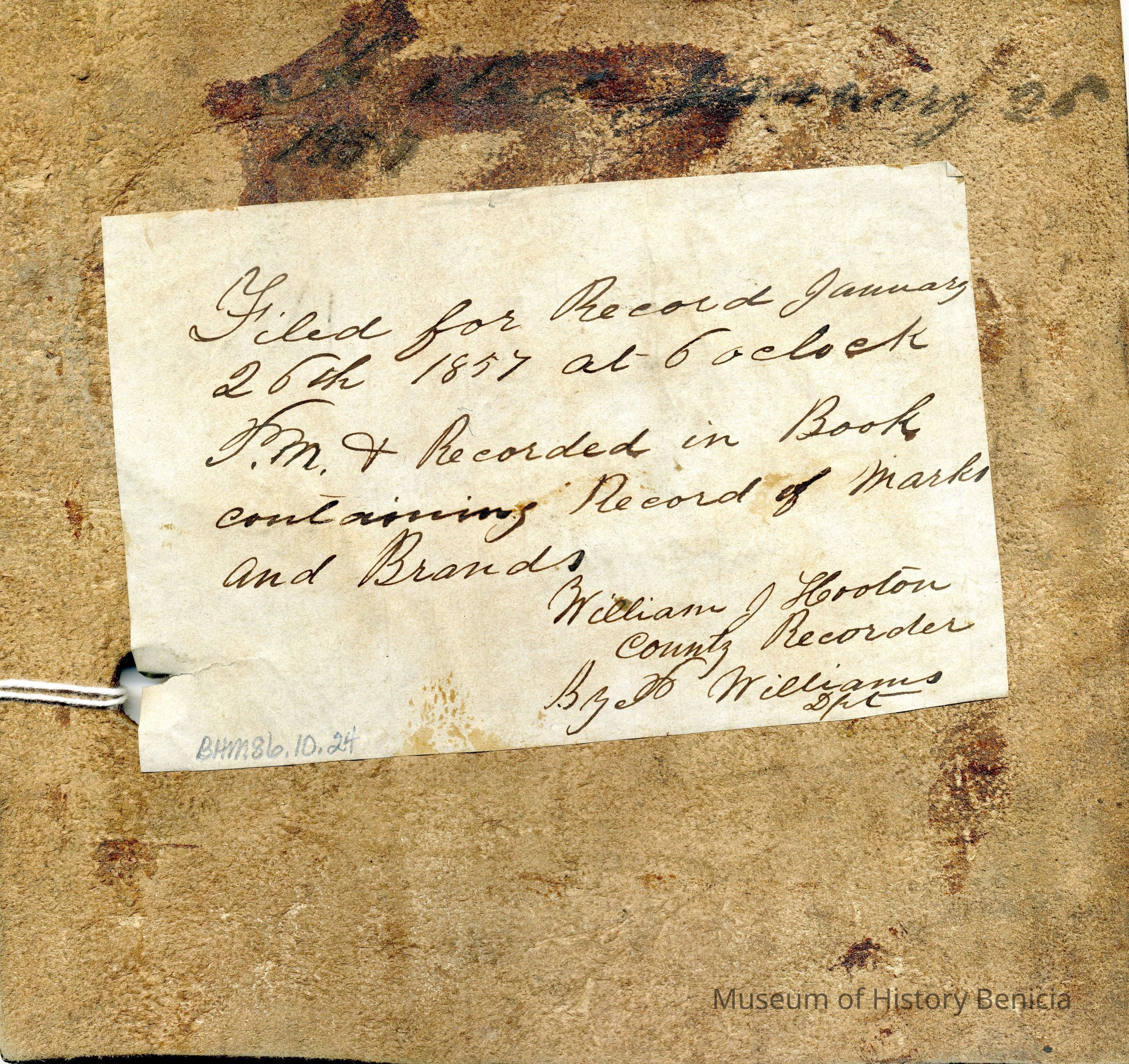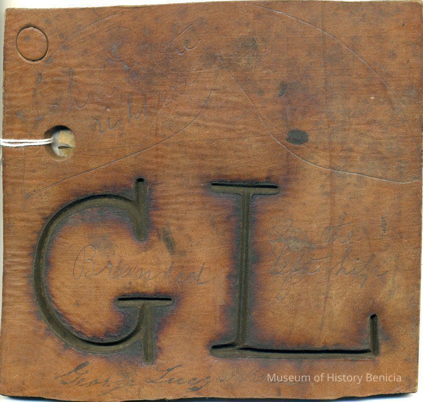 Sample brand and ear marking on a piece of leather for George Lucy, a true copy of the original filed January 26, 1857, is recorded in a Ledger of the Solano County Recorder 1855-1916. (page 12)