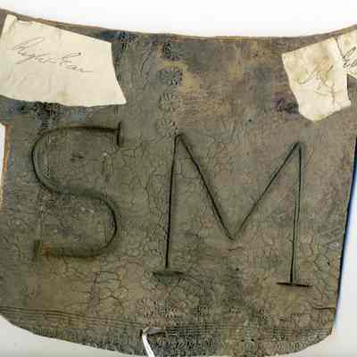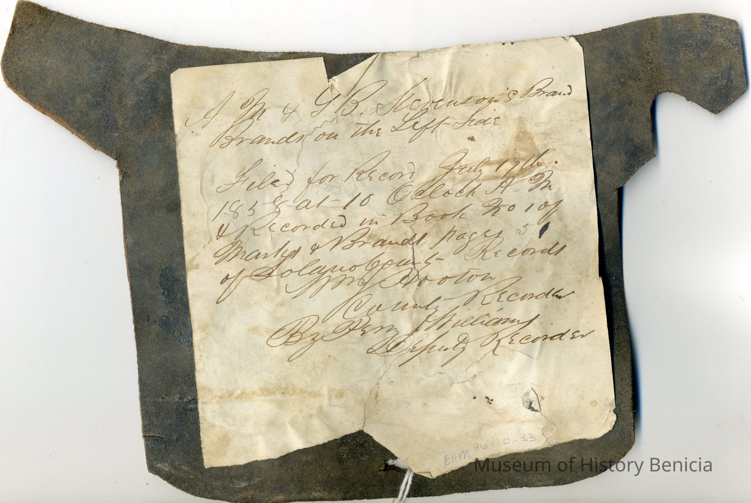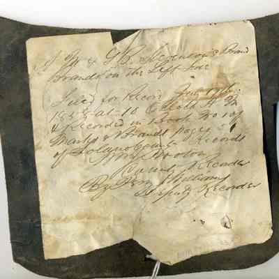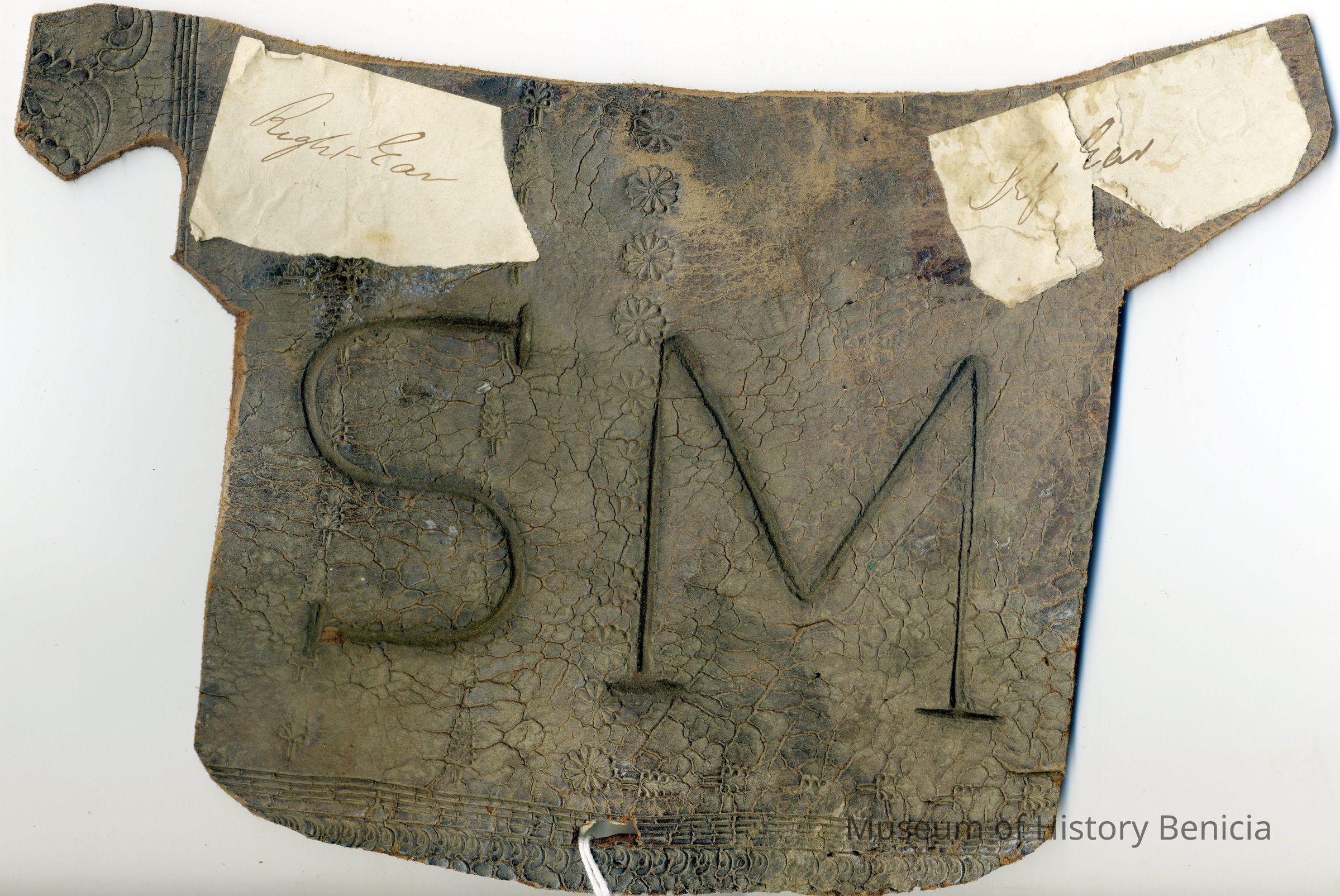 A partial copy of the recording is adhered to the back of the leather. The brand is "S M" placed on the left side; earmarkings are shown for the right and left ears.Collection