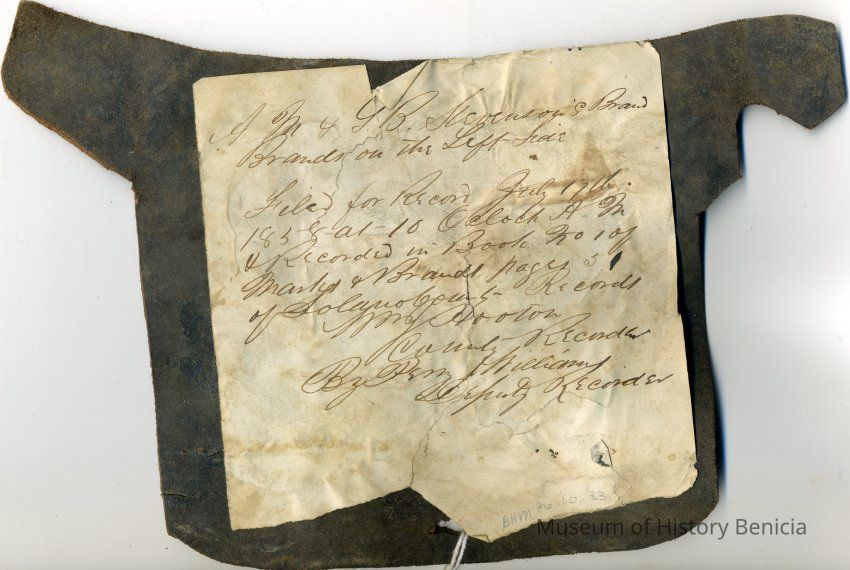 Sample brand and earmarkings on a piece of leather for A.M. & G.B. Stevenson, a true copy of the original filed July 17, 1858, is recorded in a Ledger of the Solano County Recorder 1855-1916. (page 51)