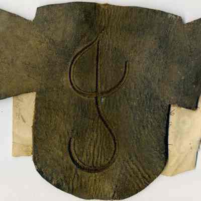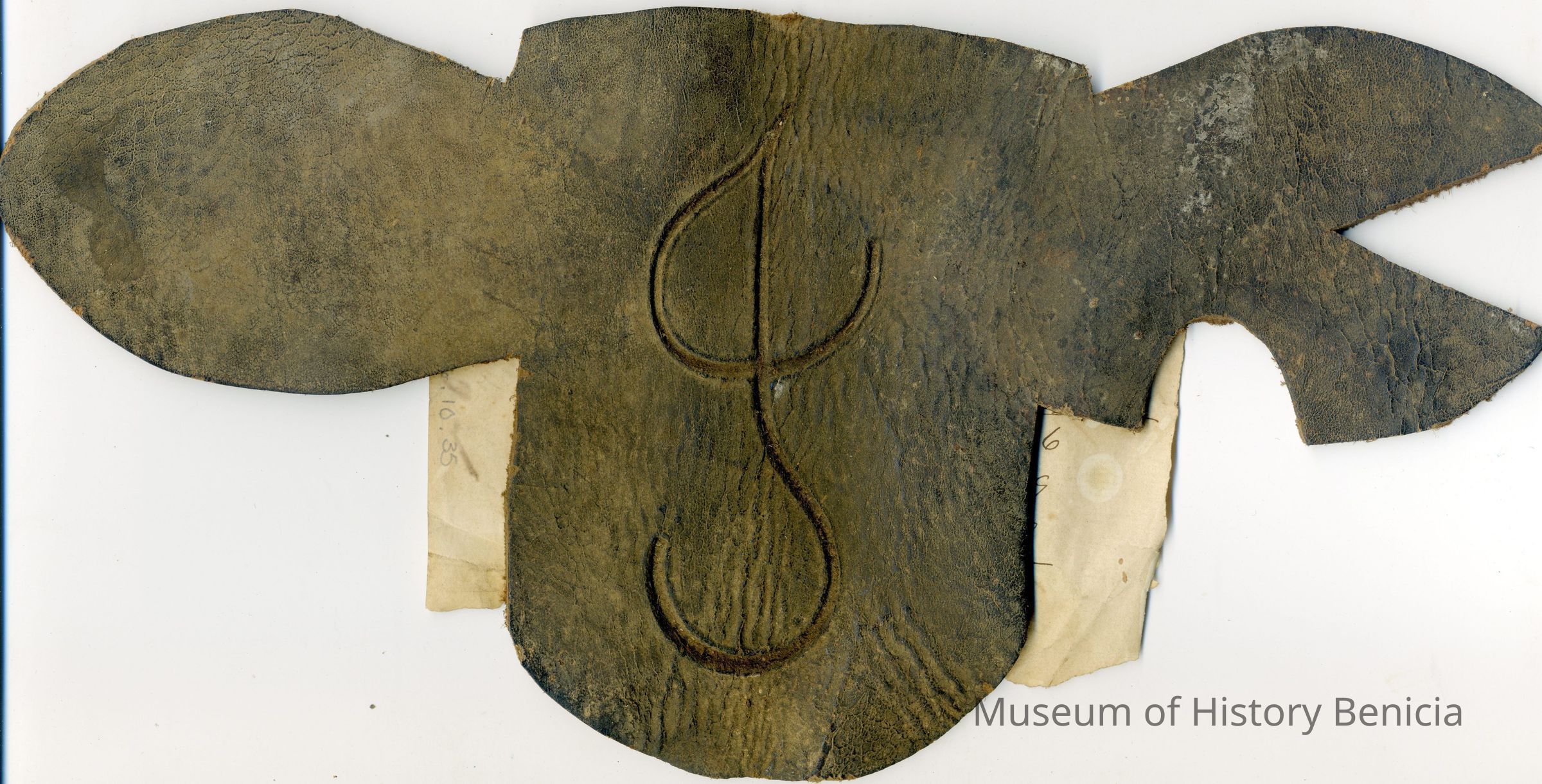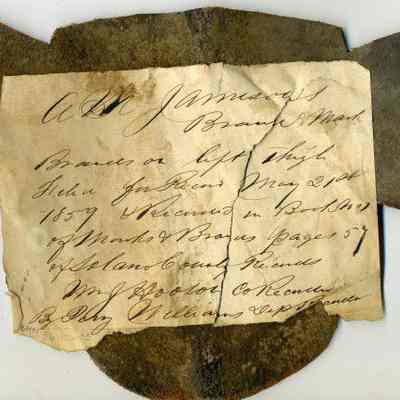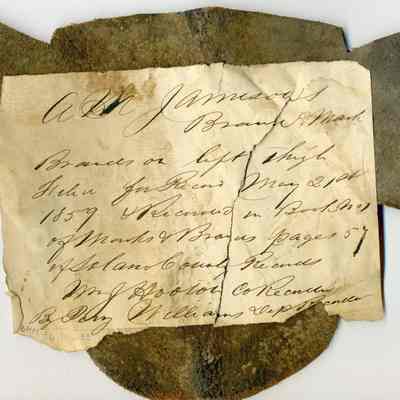A partial copy of the recording is adhered to the back of the leather (the paper is torn and a piece has become detatched). The brand is a stylized cursive "J" placed on the left thigh.