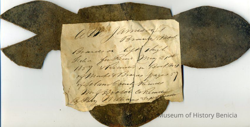 Sample brand and earmarkings on a piece of leather for A.M.Jamison, a true copy of the original filed May 21, 1859, is recorded in a Ledger of the Solano County Recorder 1855-1916. (page 57)