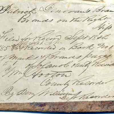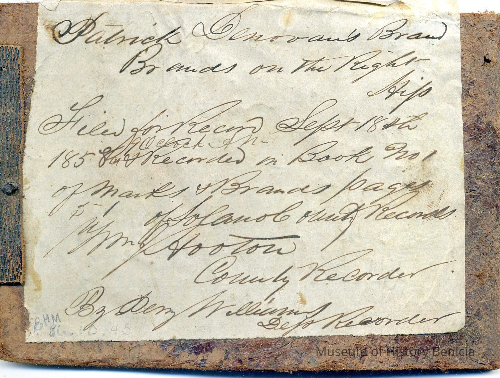 Sample brand and earmarkings on a piece of leather for Patrick Denovan, a true copy of the original filed September 18, 1858, is recorded in a Ledger of the Solano County Recorder 1855-1916. (page 51)