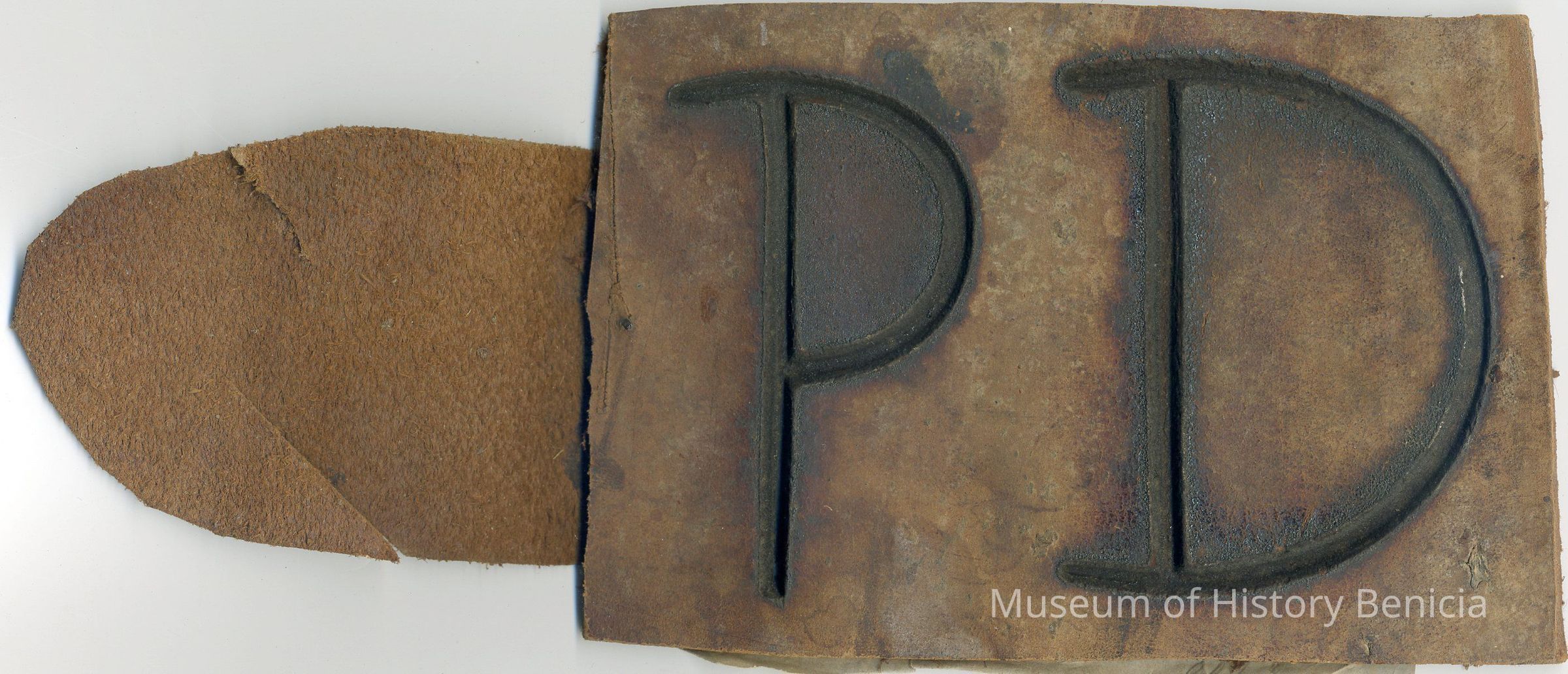 A partial copy of the original recording is adhered to the back of the leather. The brand is "P D" and placed on the right hip. The sample earmarkings are attached to the leftside of the piece with a small nail with the head of the nail on the back and the point protruding towards the front.Collection