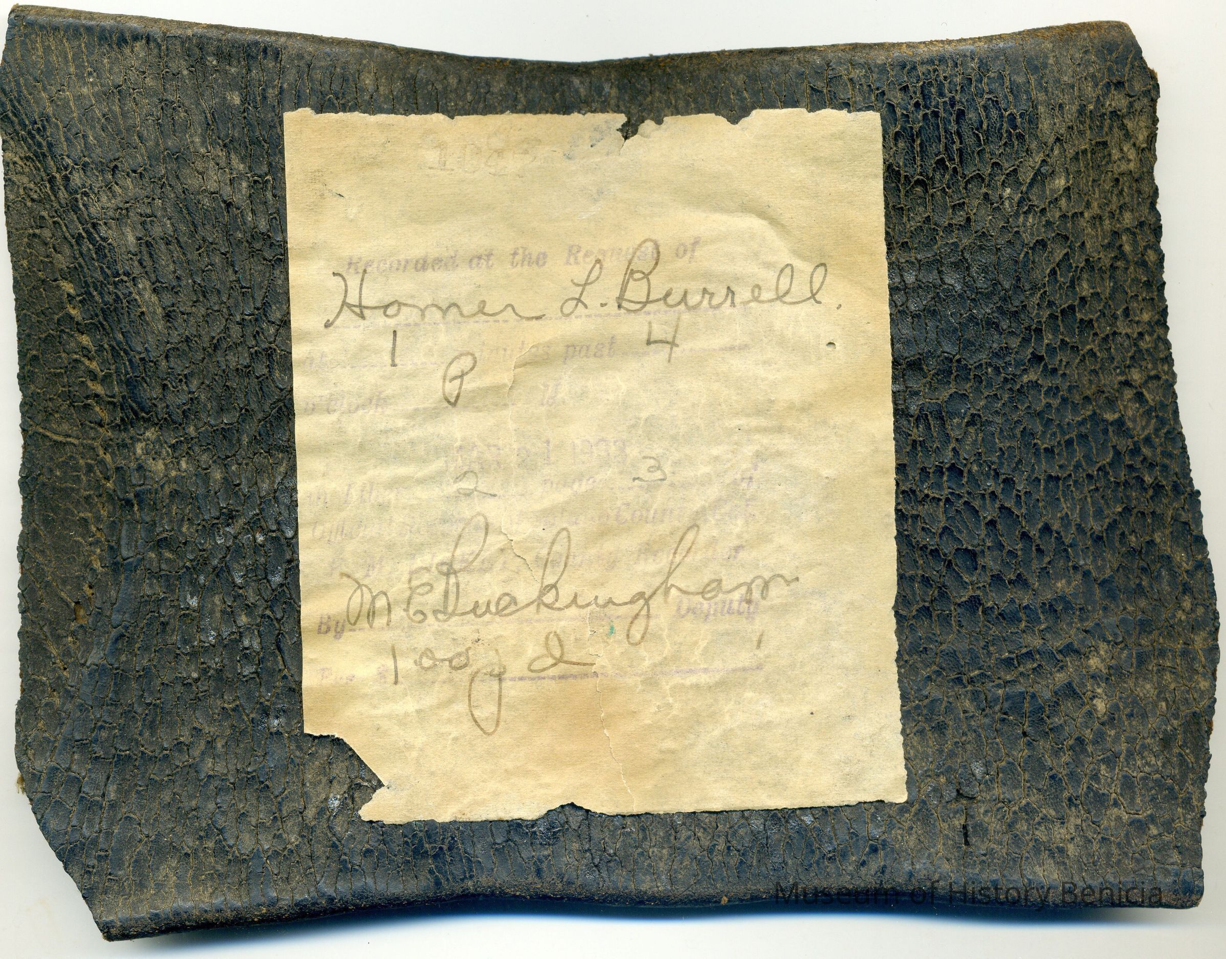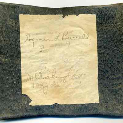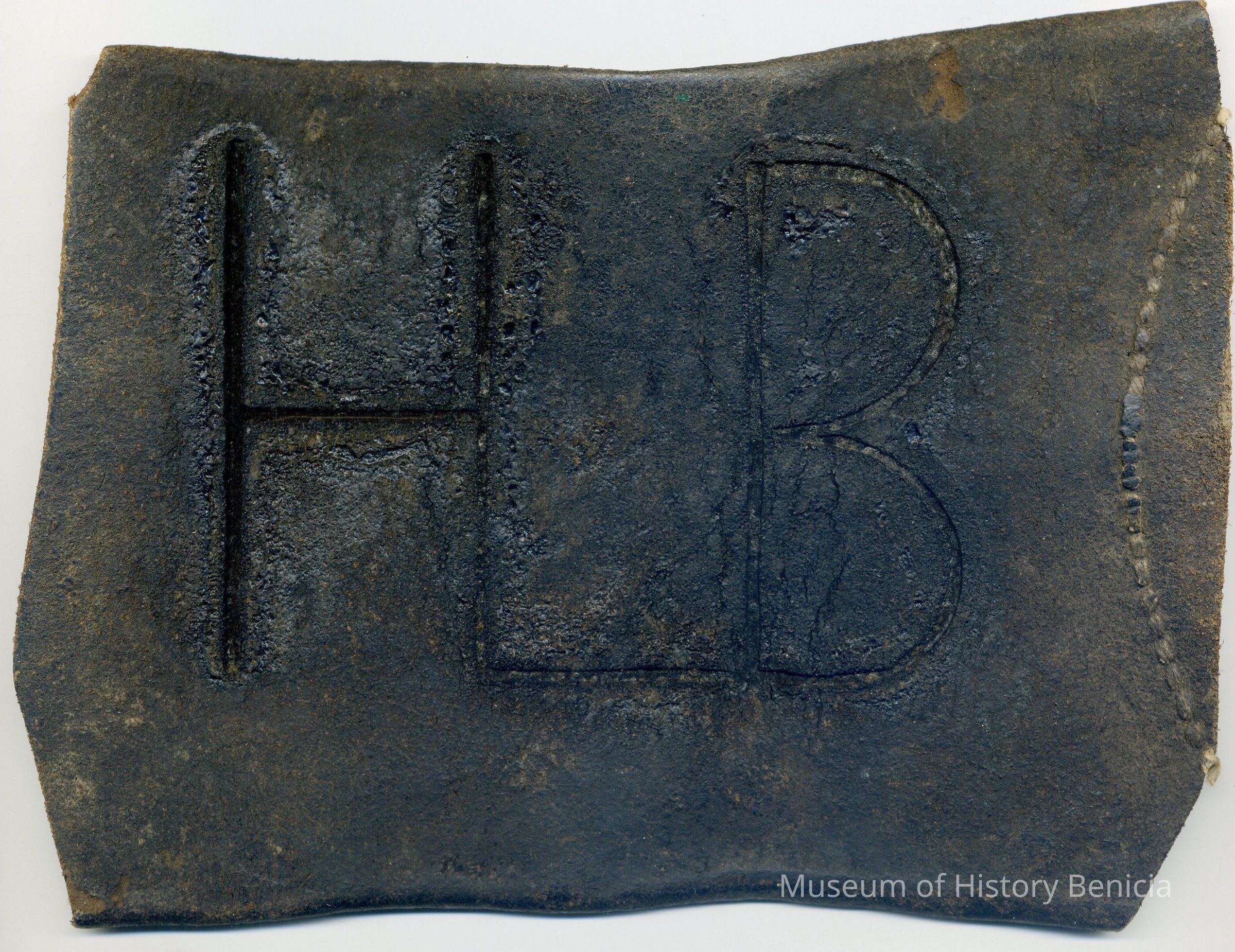 Roughly rectangular piece of leather covered with a black coating. Initials "HLB" branded on. Twine stitched along right side. Paper glued on back reading: "Recorded at the Request of Homer L. Burrell at one minutes past 4 o'clock P.M. Mar. 21, 1903 in Liber 2 page 3...by M. E. Buckingham, Deputy. Per $1.00 pd."Collection