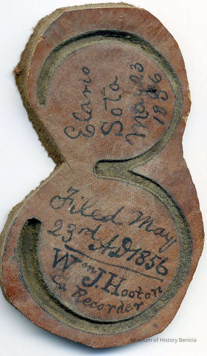 Sample brand on a piece of leather for Elario Sota, a true copy of the original filed May 23, 1856, is recorded in a Ledger of the Solano County Recorder 1855-1916. (page 6)