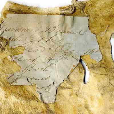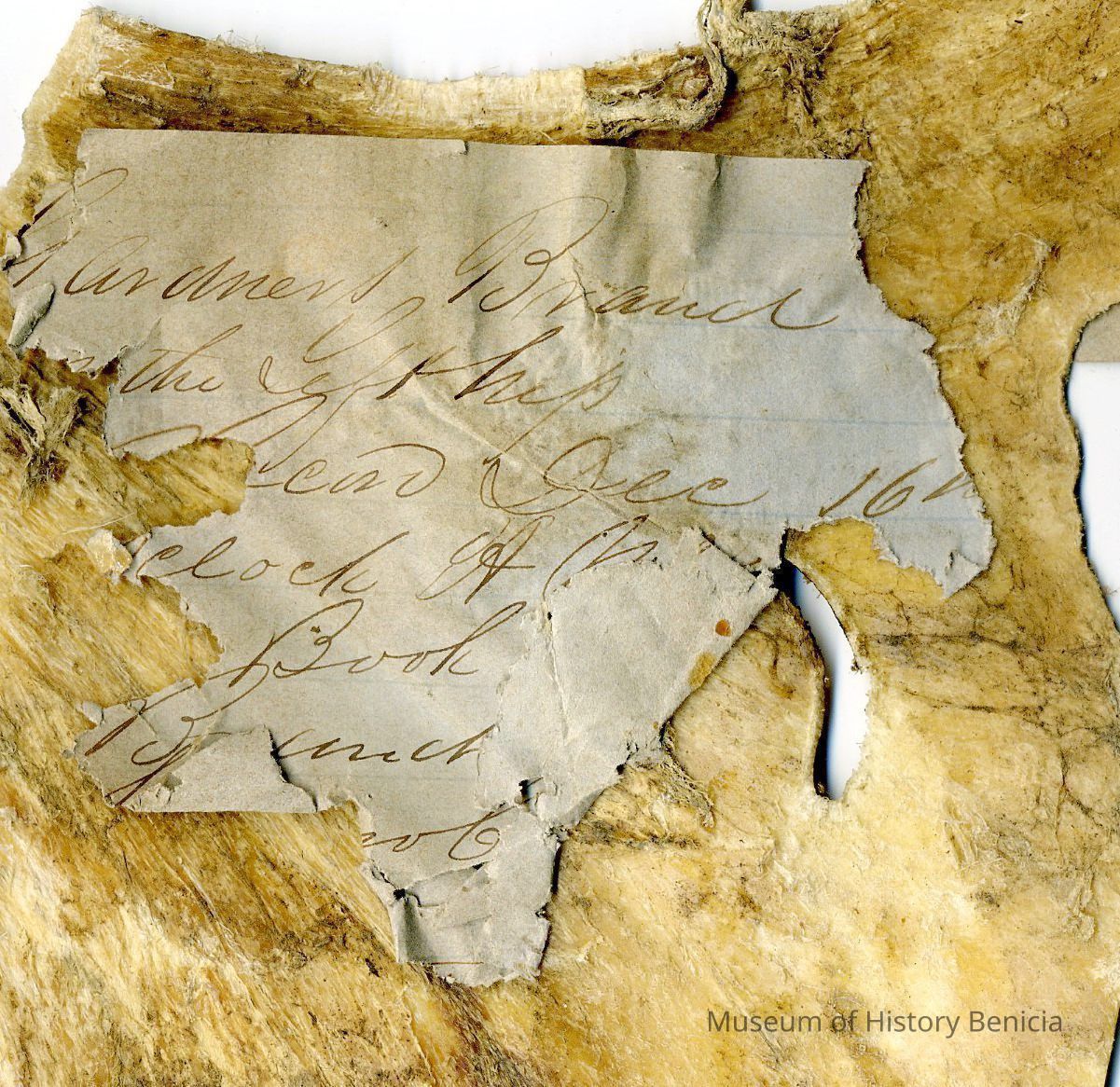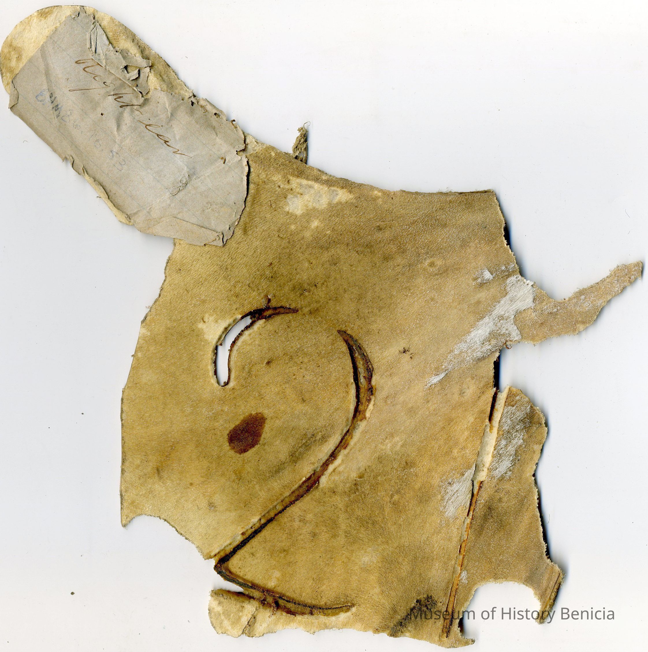 A partial copy (sections are missing) of the original recording is adhered to the back of the leather. Parts of the right side of the leather are missing/broken off. The brand is "2 1" and placed on the left hip.Collection
