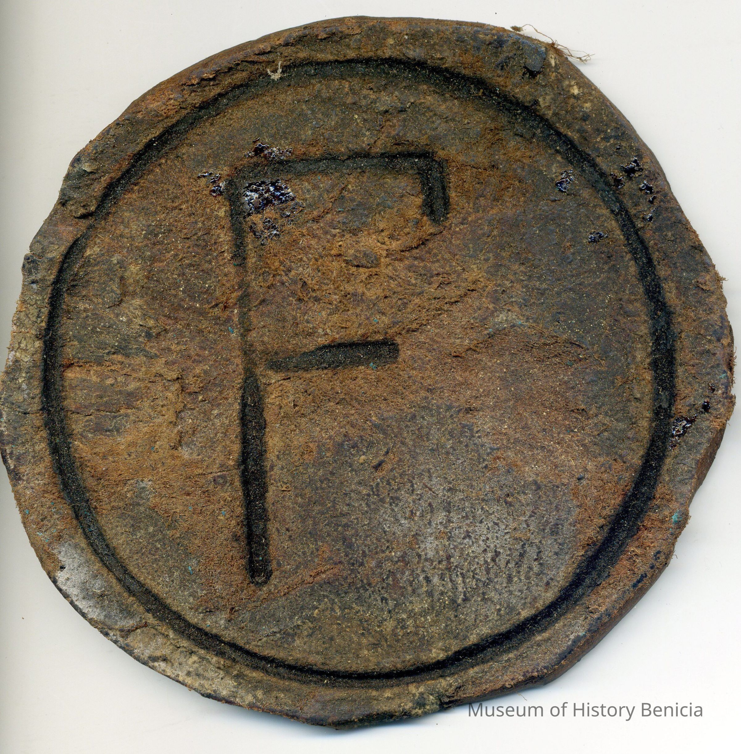 No copy of the registration is adhered to the back of the piece of leather. The brand is a capital F inside of a circle and is placed on the right side.Collection