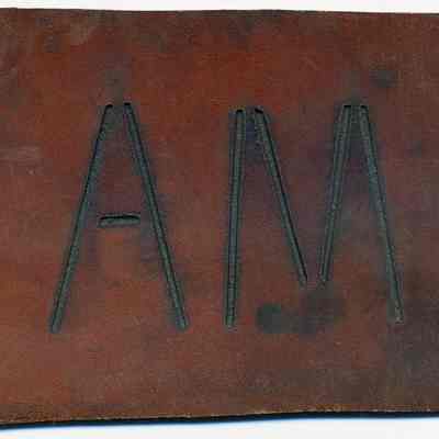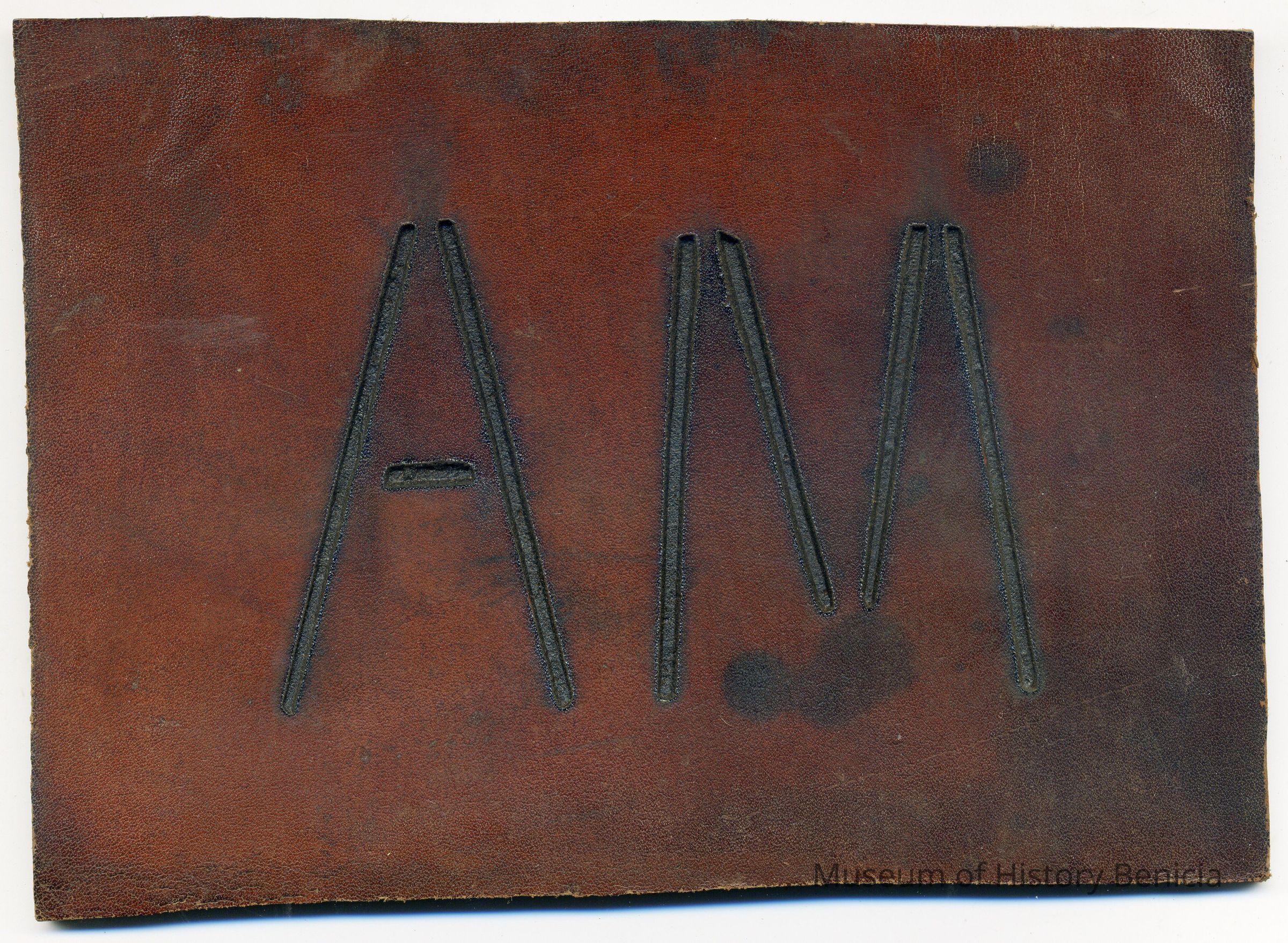 Sample brand on a piece of leather for an unknown individual, registration date is unknown because no information is written in a Ledger of the Solano County Recorder 1855-1916.