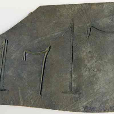 No paper is adhered to the back of the piece. The brand is "17" (repeated twice). Repeating the brand with one being larger than the other could indicate sizes for different animals such as sheep and cows or different locations or the sex of the branded animal.Collection