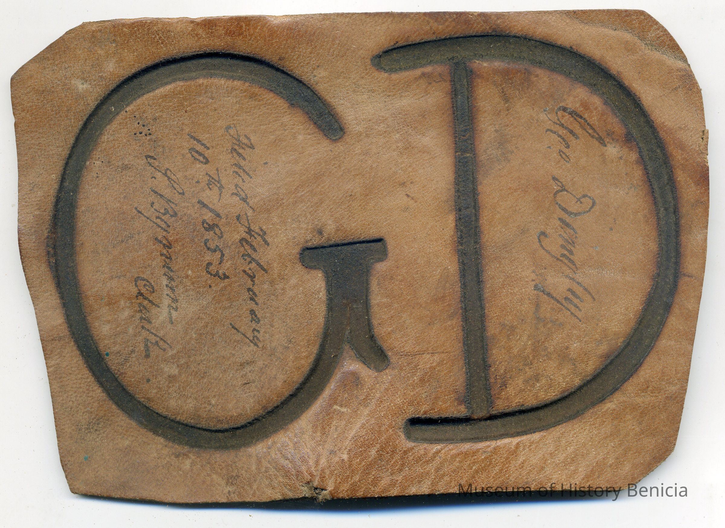 Sample brand on a piece of leather for George Dingley, registered on February 10, 1853, but is not written in a Ledger of the Solano County Recorder 1855-1916.