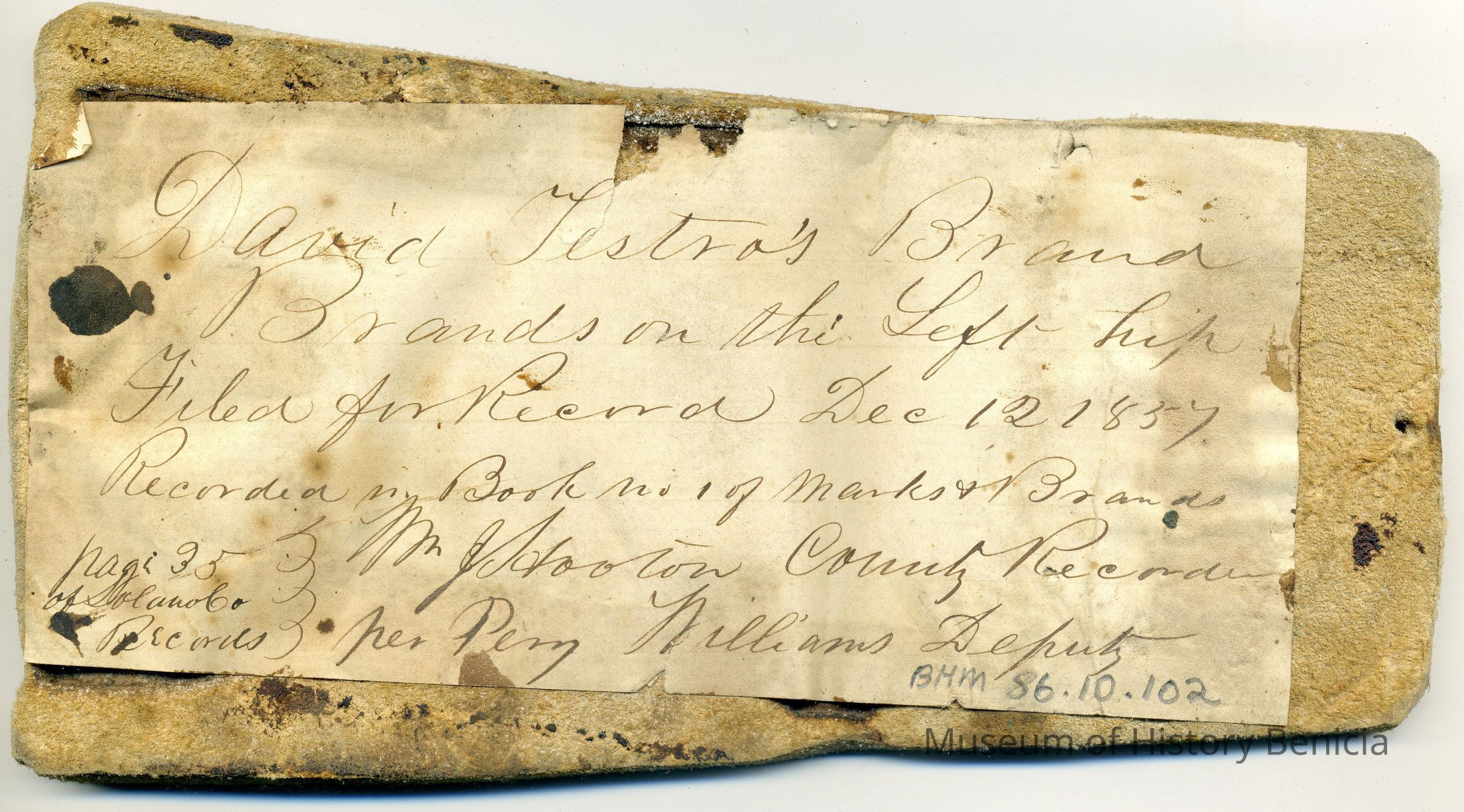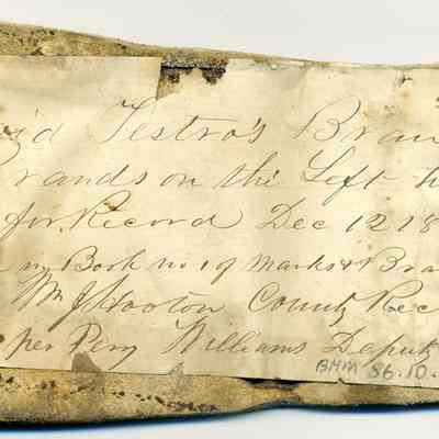 A partial copy of the original recording is adhered to the back of the leather. The brand is "D T" and placed on the left hip.Collection