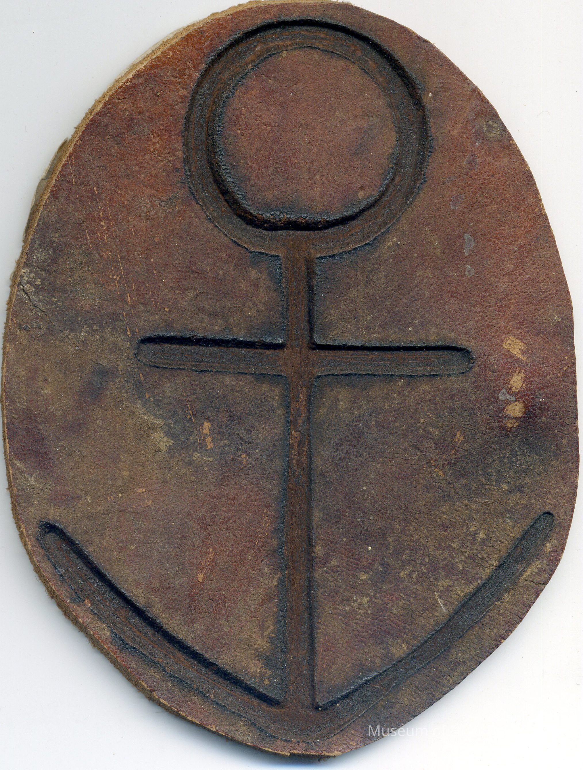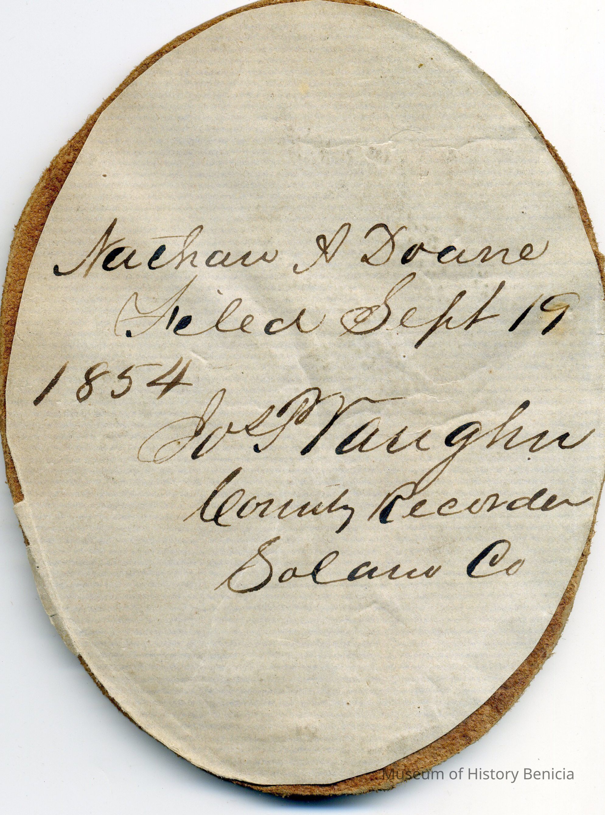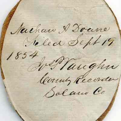 AAnchor symbol branded on oval of reddish leather. Paper glued on back reads: "Nathan A. Downe. Filed Sept 19, 1854. Josf. Vaughn, County Recorder, Solano County."Collection