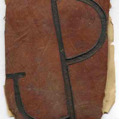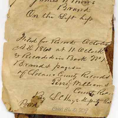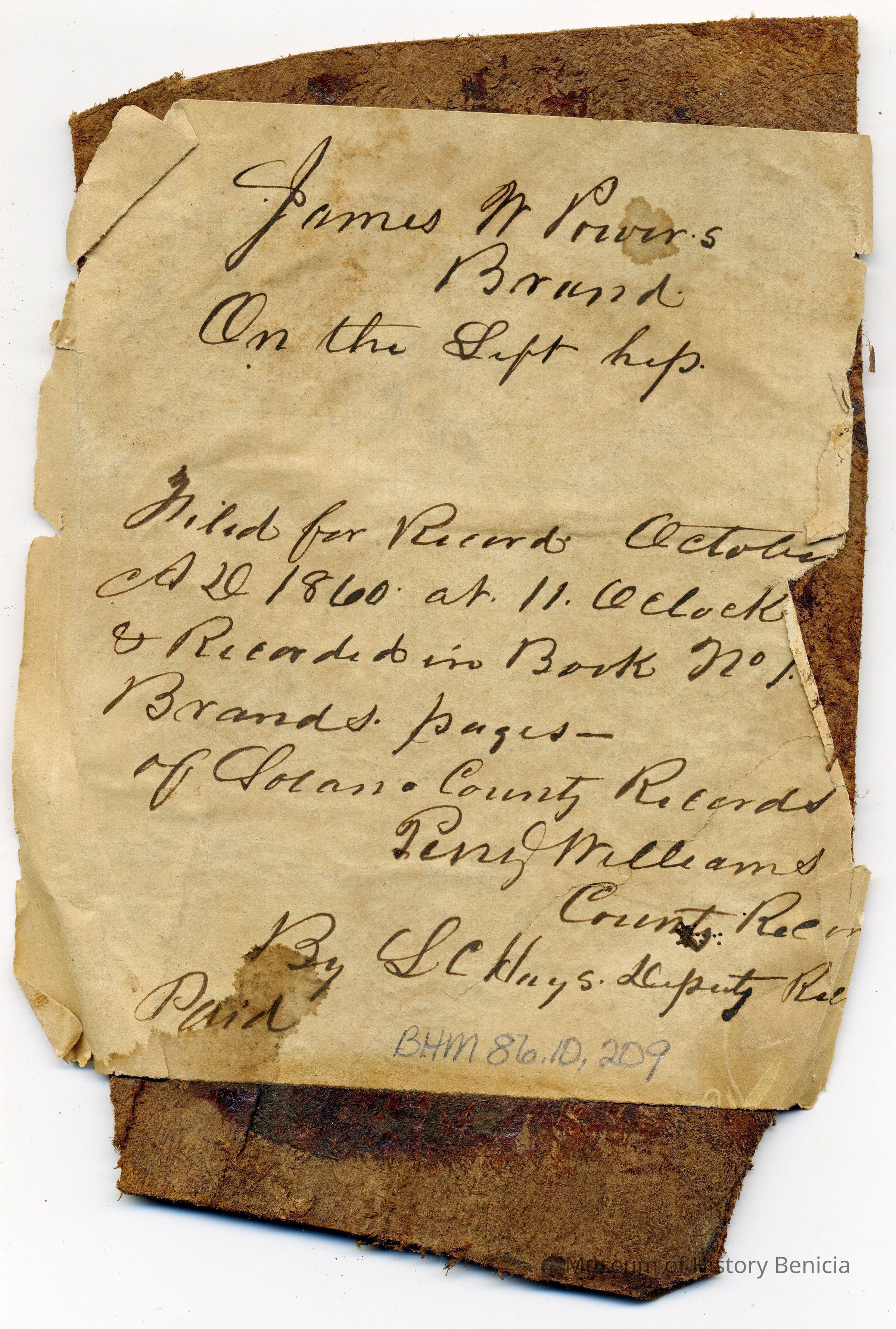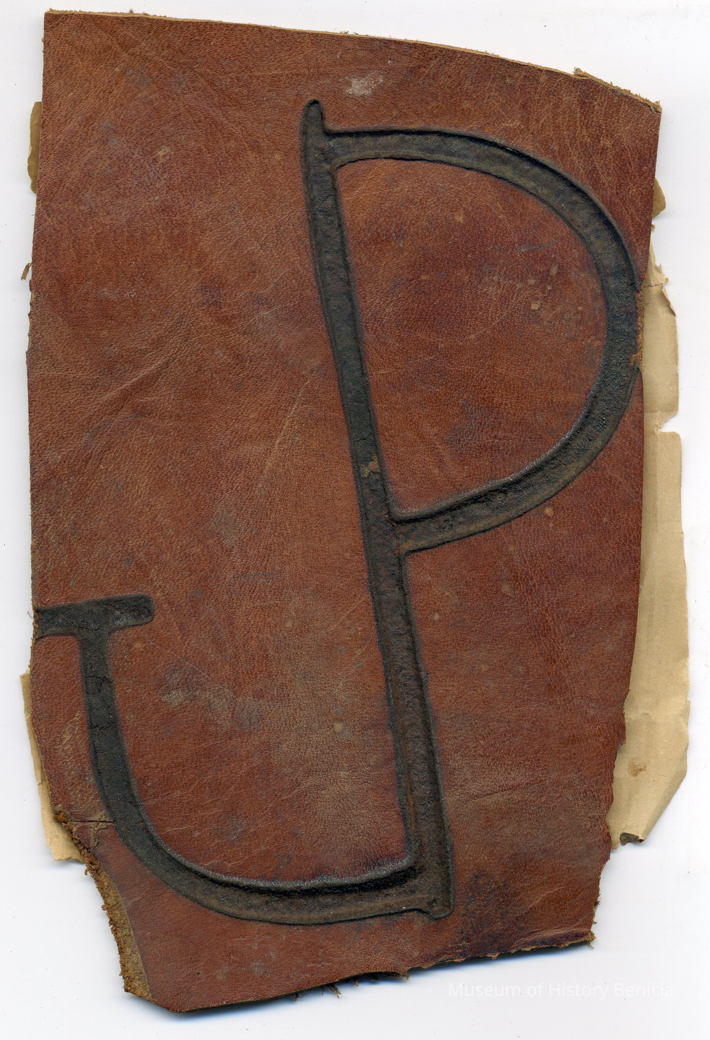 Sample brand on a piece of leather for James W. Paven (?), registered on October 13, 1860 and is written in a Ledger of the Solano County Recorder 1855-1916. (page 64)