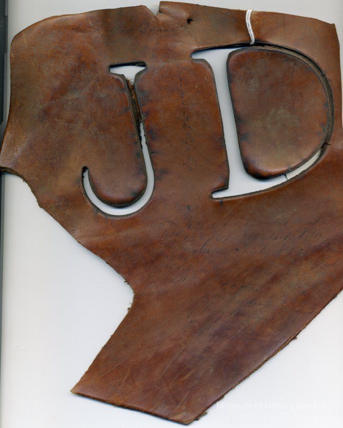 Sample brand cut into a piece of leather for John Dalton, a true copy of the original filed October 6, 1857 is recorded in a Ledger of the Solano County Recorder 1855-1916. (page 25)