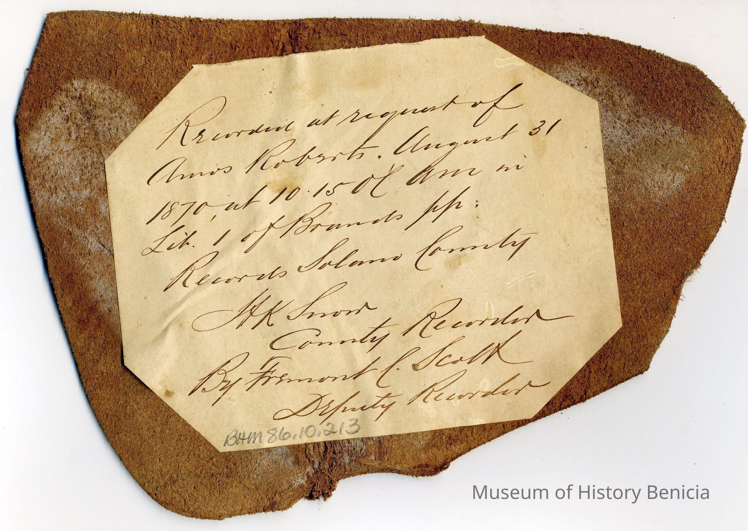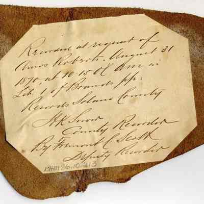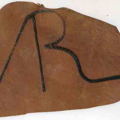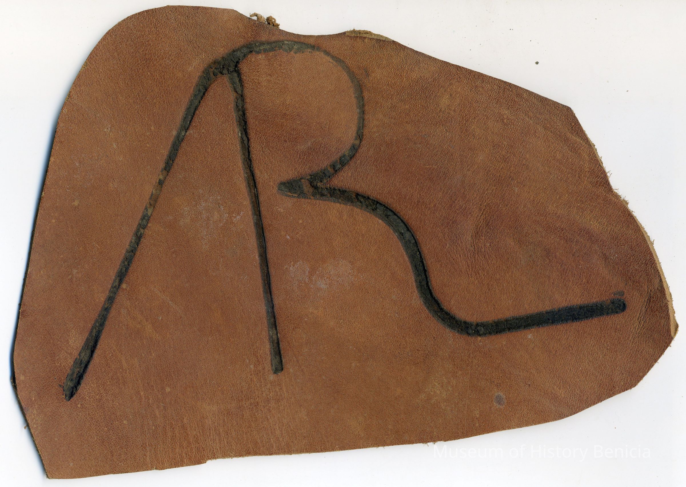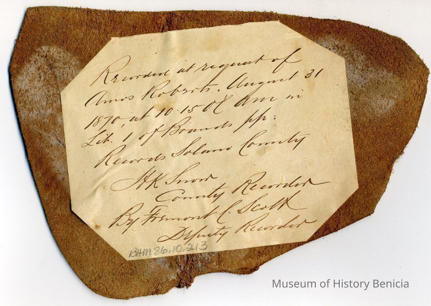 Sample brand on a piece of leather for Amos Roberts, registered on August 31, 1870, and is written in a Ledger of the Solano County Recorder 1855-1916. (page 78)