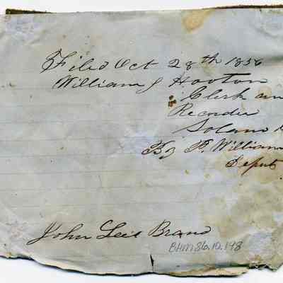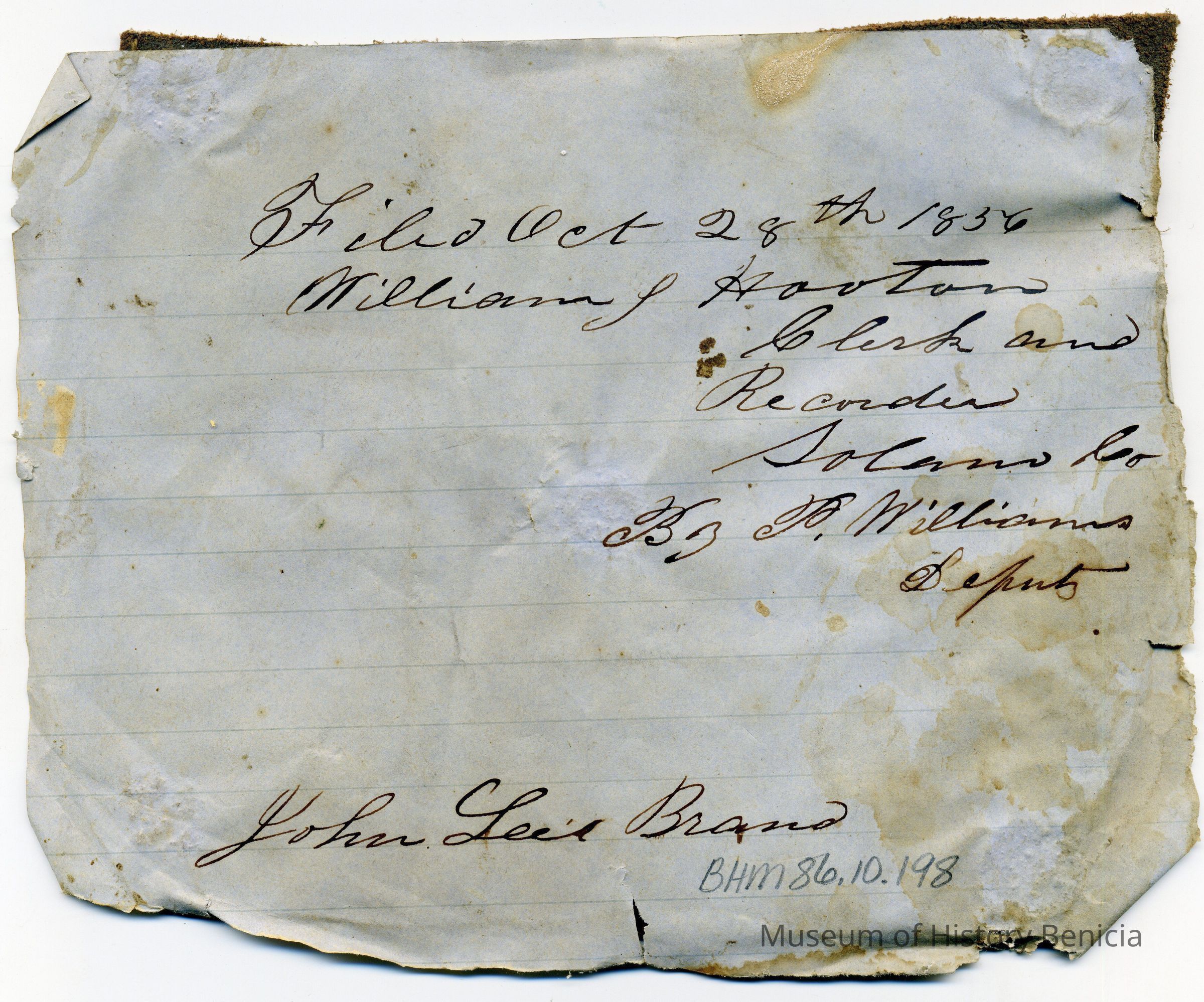 Sample brand on a piece of leather for John Lee, registered on October 28, 1856, as written in a Ledger of the Solano County Recorder 1855-1916. (page 10)