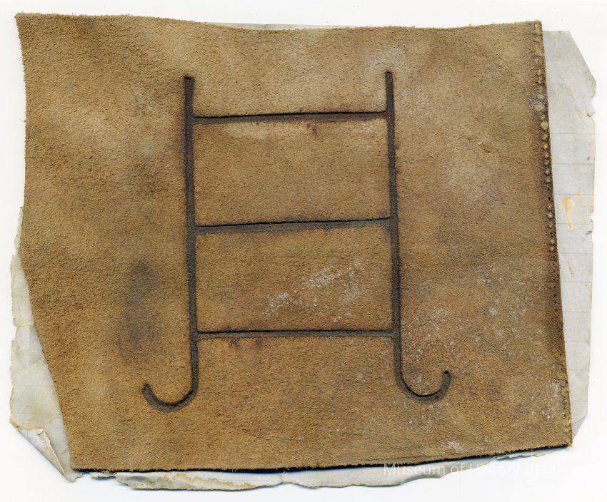 A partial copy of the original recording is adhered to the back of the piece of leather. The brand is a regular capital J and a backward capital J connected by three lines and no placement is noted.Collection