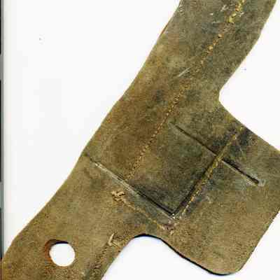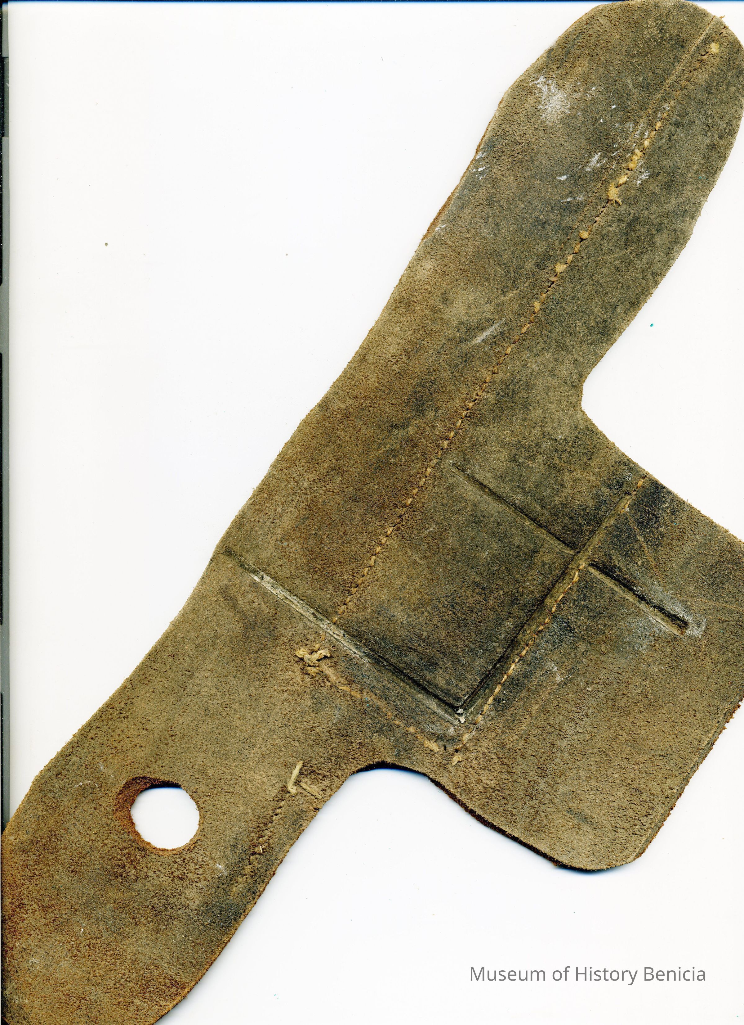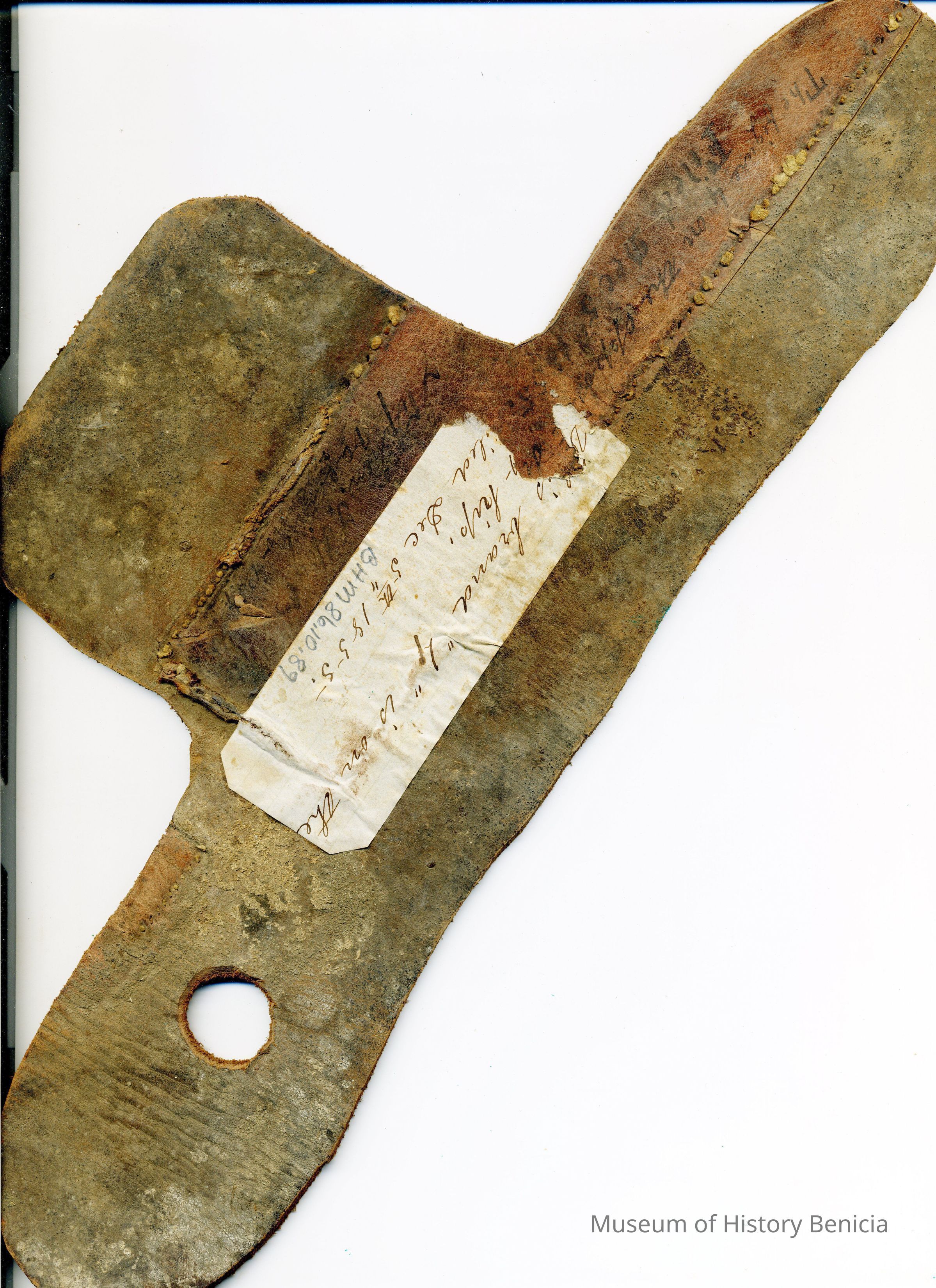 A partial copy of the recording is attached to the back of the leather, along with some information written on the front around the brand in ink. The brand is a "4" and is placed on the left hip. The earmark is a hole in the left ear and a slit in the right ear.Collection