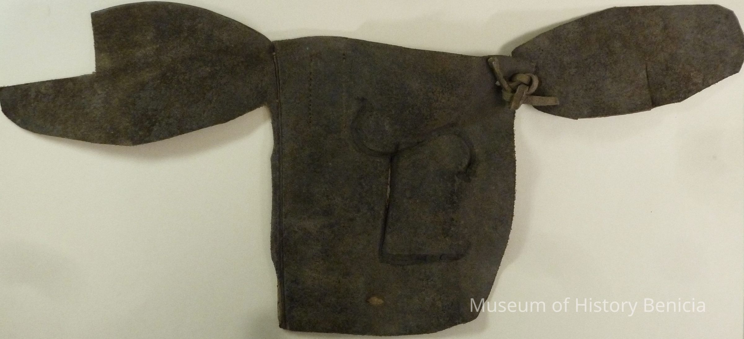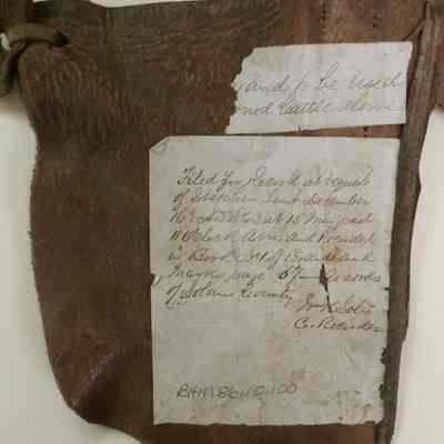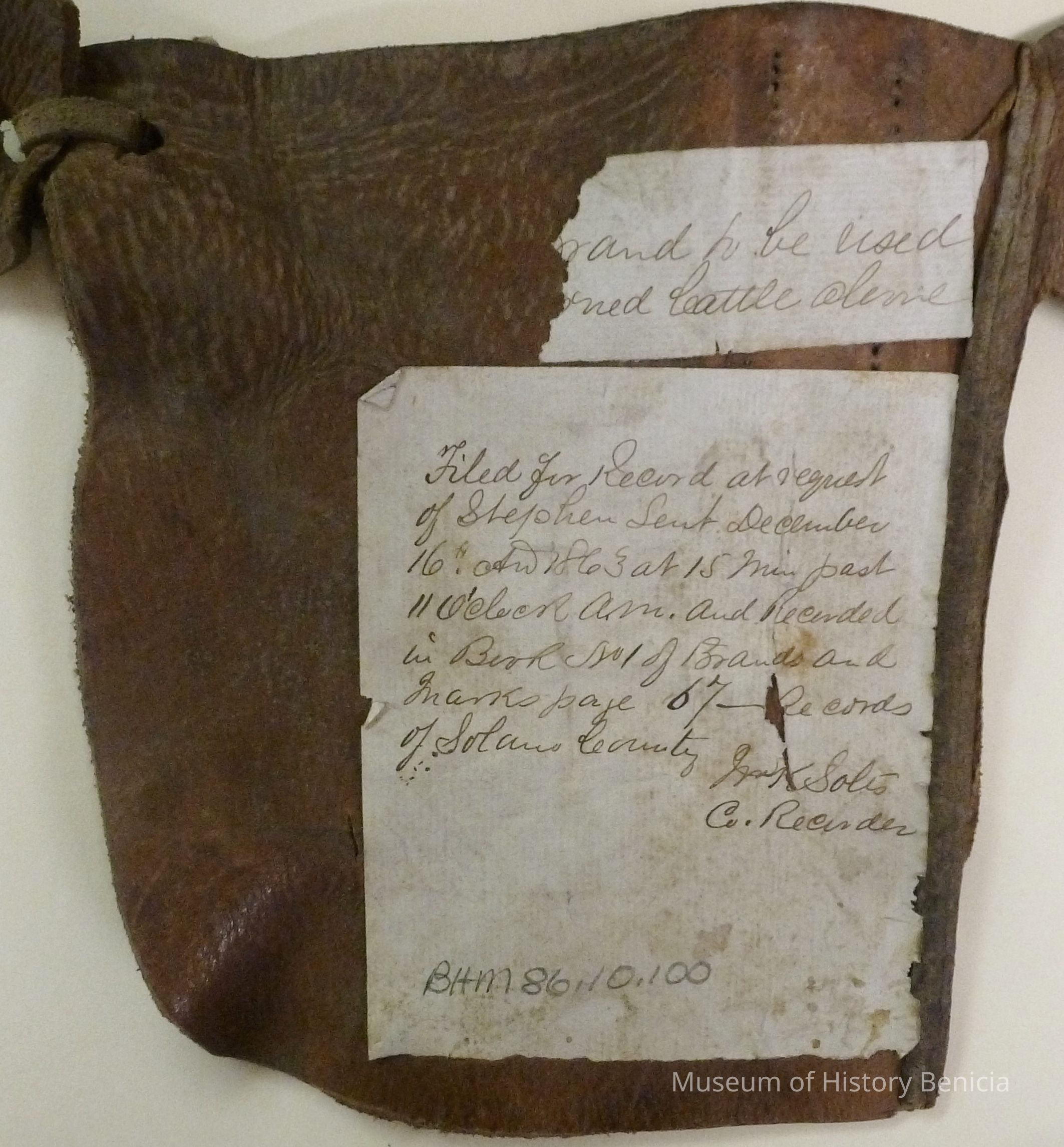 A partial copy of the original recording is adhered to the back of the leather. The brand is a capital "L" with a sideways "S" attached to its top. One earmark is part of the large piece and the other is attached with a piece of thin rawhide.Collection