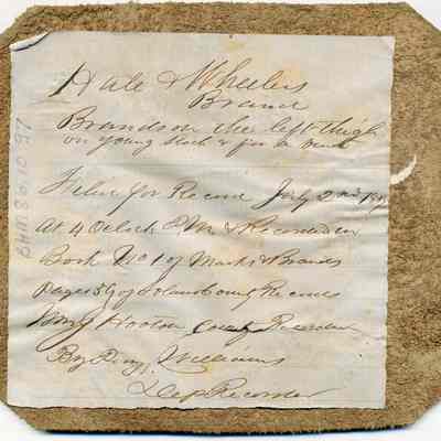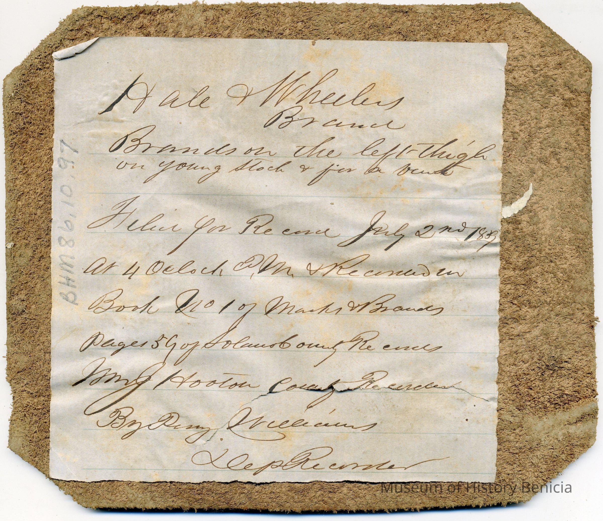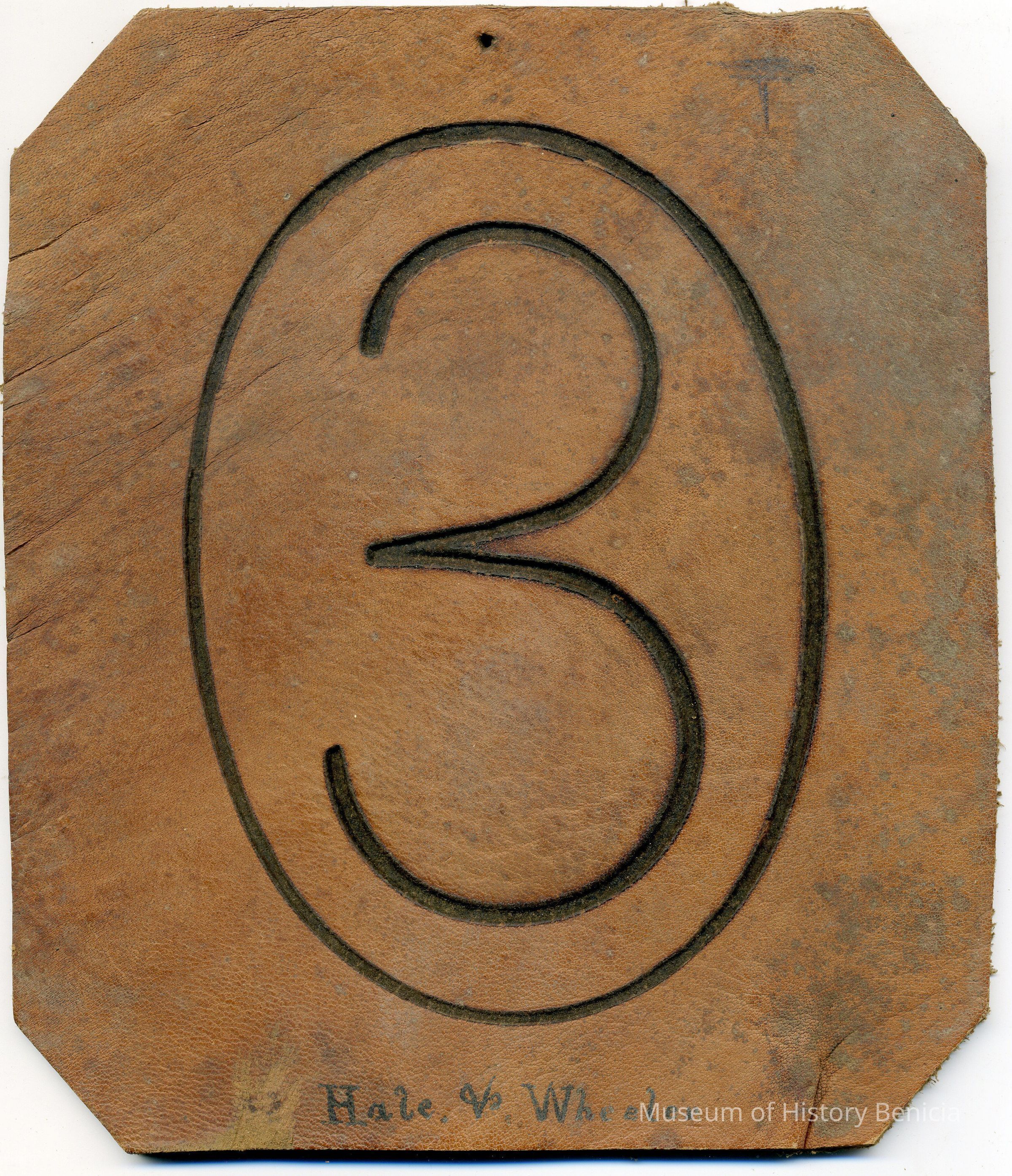 A partial copy of the original recording is adhered to the back of the leather. The brand is the number 3 inside on an oval. "Hale + Wheeler" is written in ink near the bottom of the front of the piece of leather. This is identical to BHM86.10.40Collection