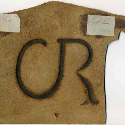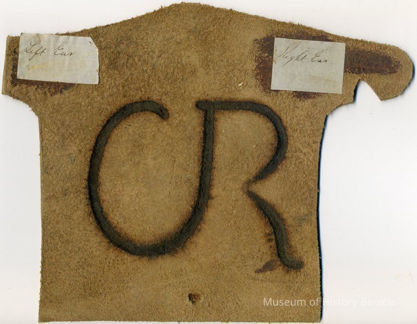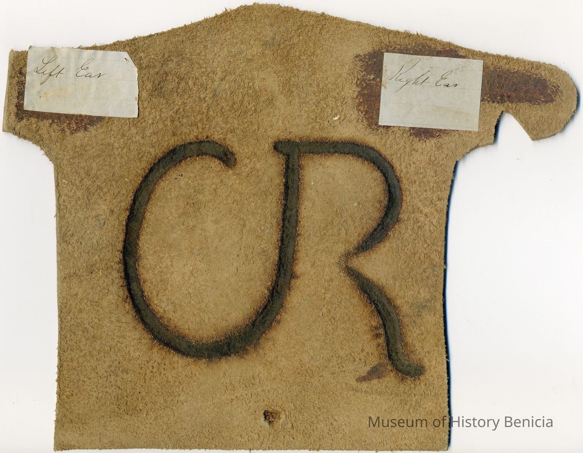 A partial copy of the recording is attached to the back of the leather. The brand is a capital "C" attached to a capital "R" on the right. The placement is on the right hip. The earmarks are indicated with paper attached to the front of the leather.Collection