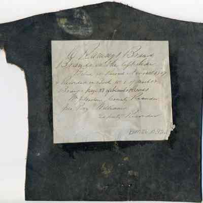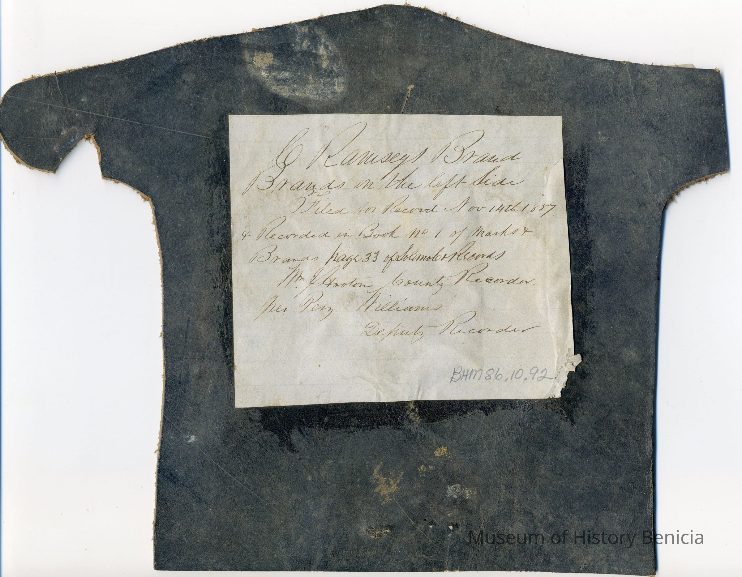 Sample brand/earmarks on leather for Charles Ramsey, registered on November 14, 1857, as written in a Ledger of Solano County Recorder 1855-1916. (page 33)