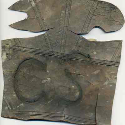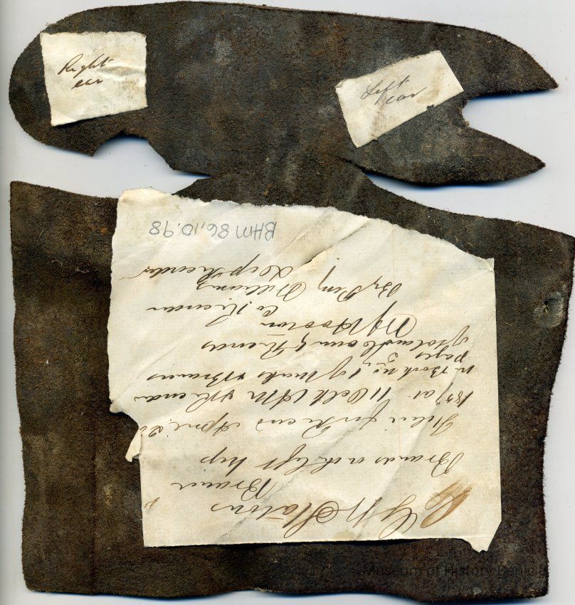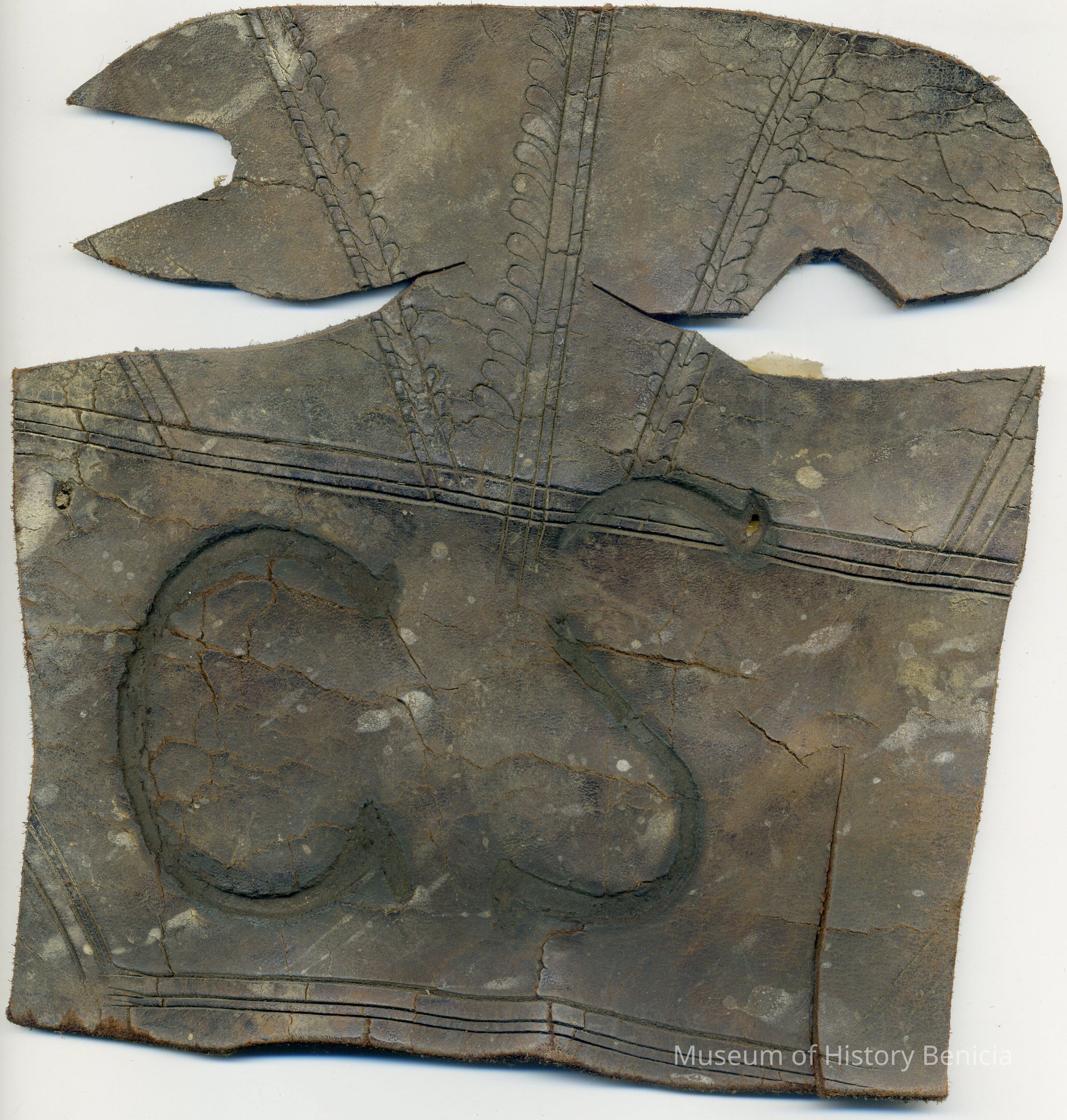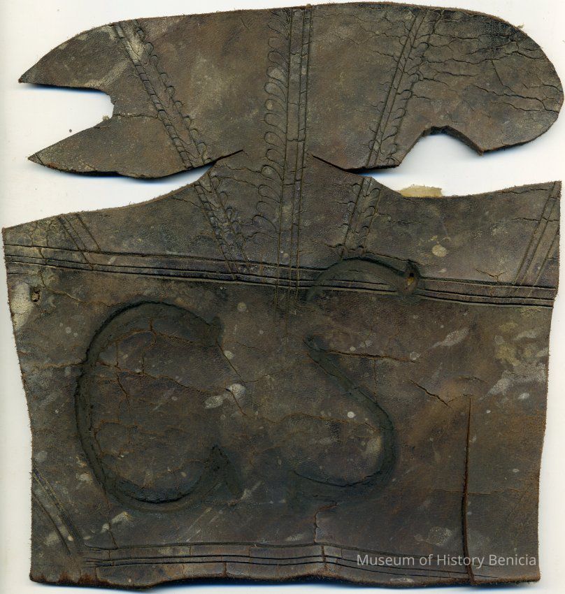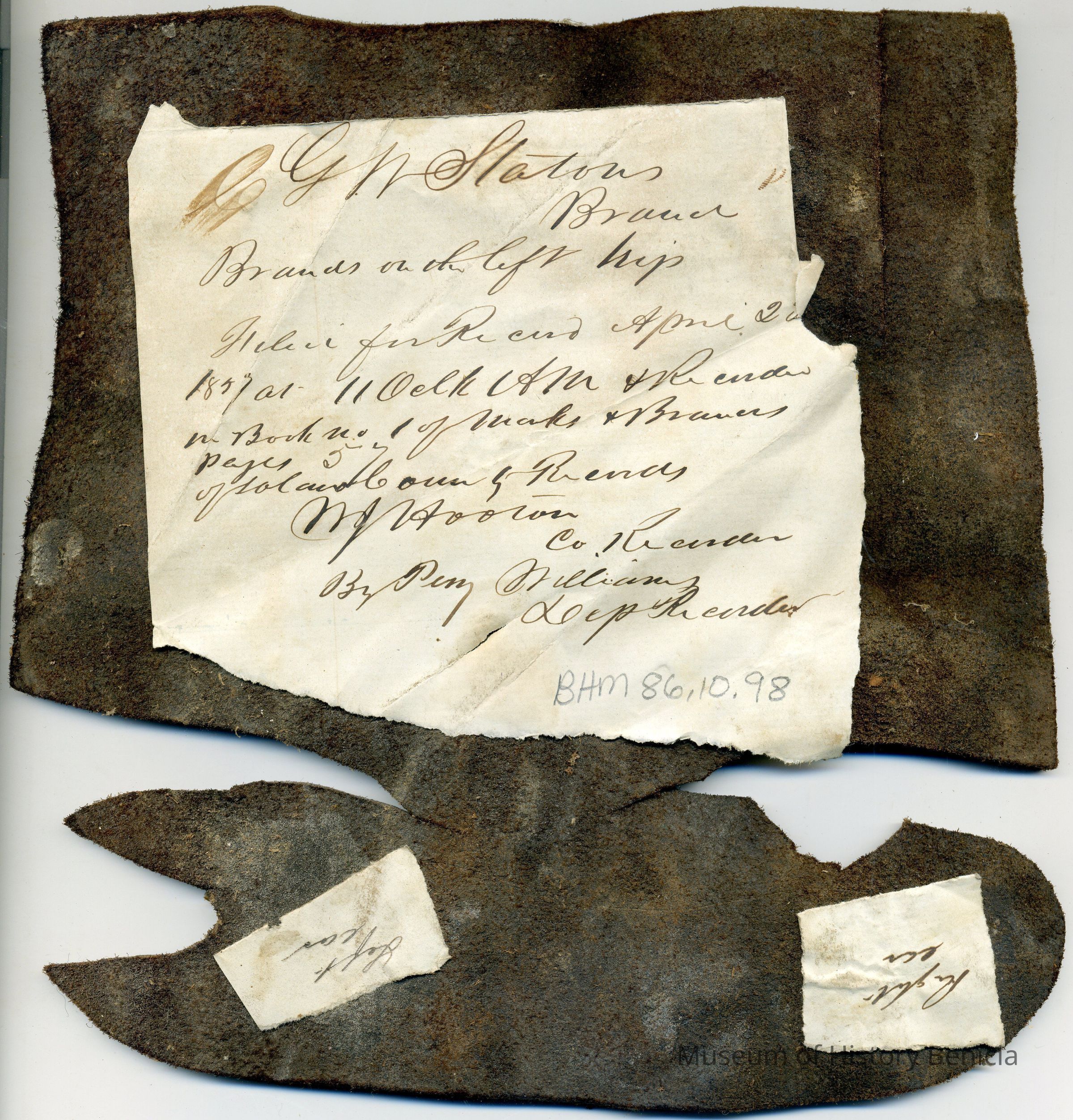A partial copy of the original recording is adhered to the back of the leather. The brand is "C S" and placed on the left hip. The earmarks are indicated on the top of the leather piece.Collection