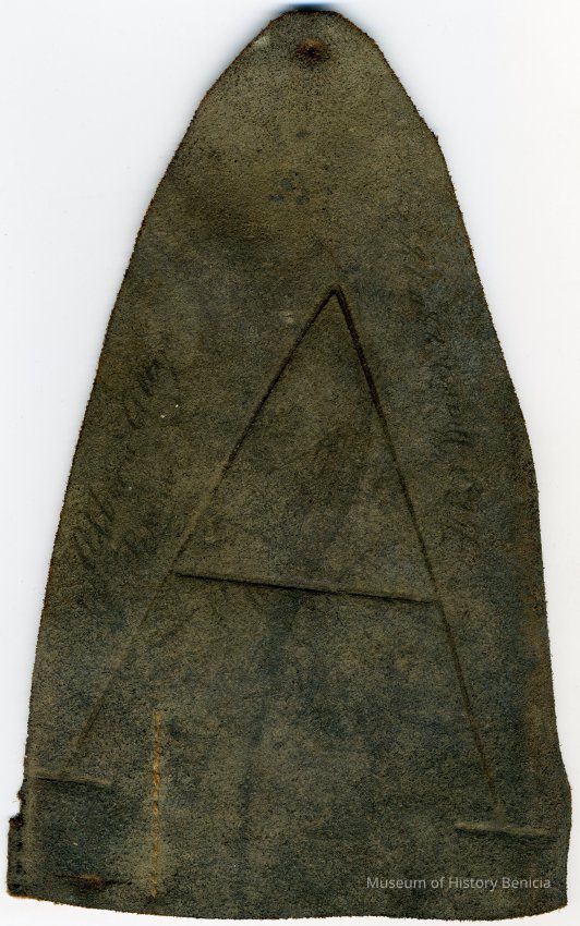 Sample brand/earmarks on leather for A.H. Allen (possibly), registered on March 28, 1855. No copy is recorded in a Ledger of Solano County Recorder 1855-1916.