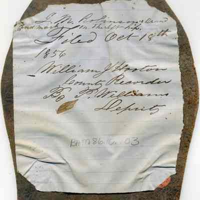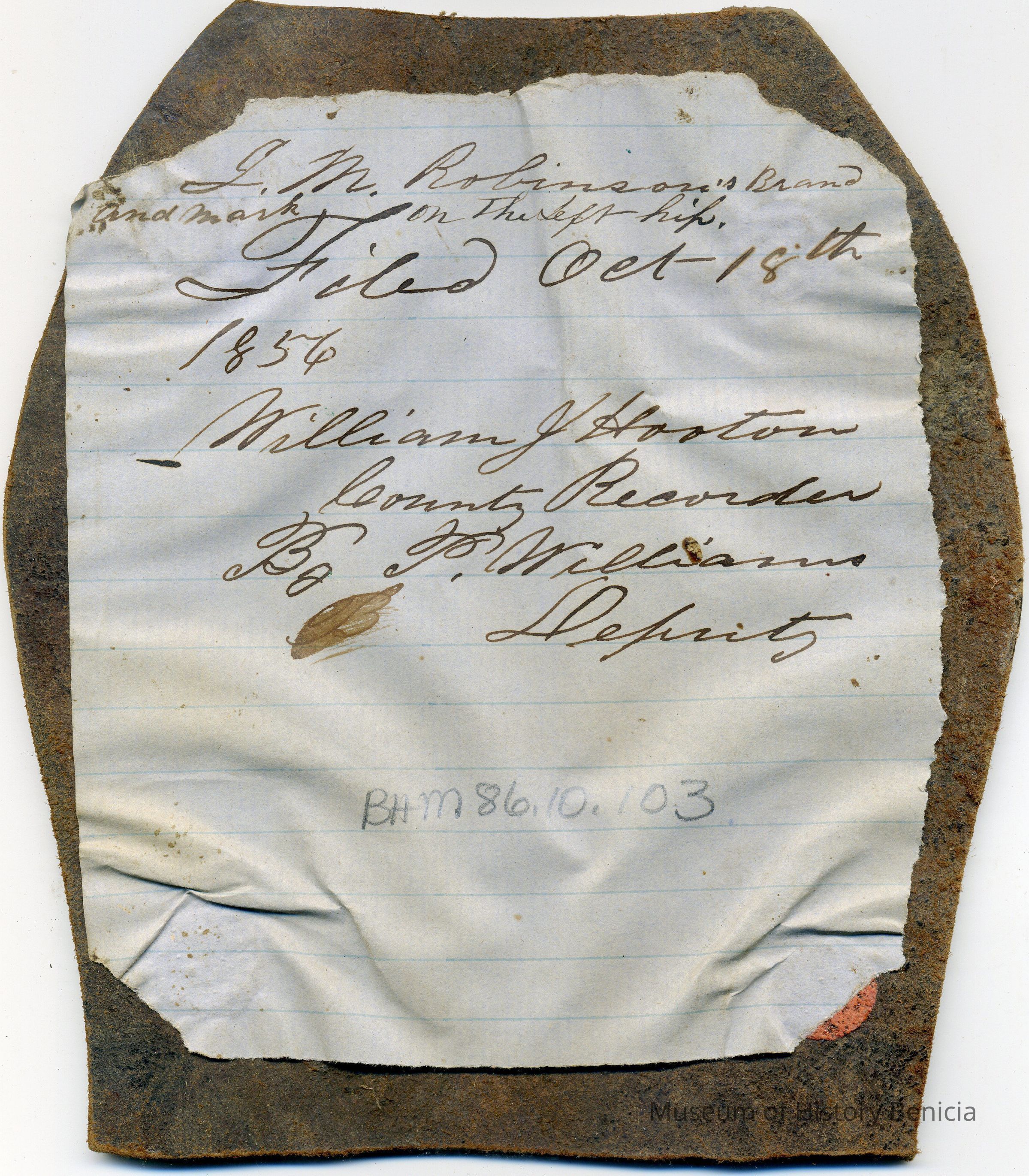 Sample brand on a piece of leather for J.M. Robinson, registered on October 18, 1856, as written in a Ledger of the Solano County Recorder 1855-1916. (page 10)