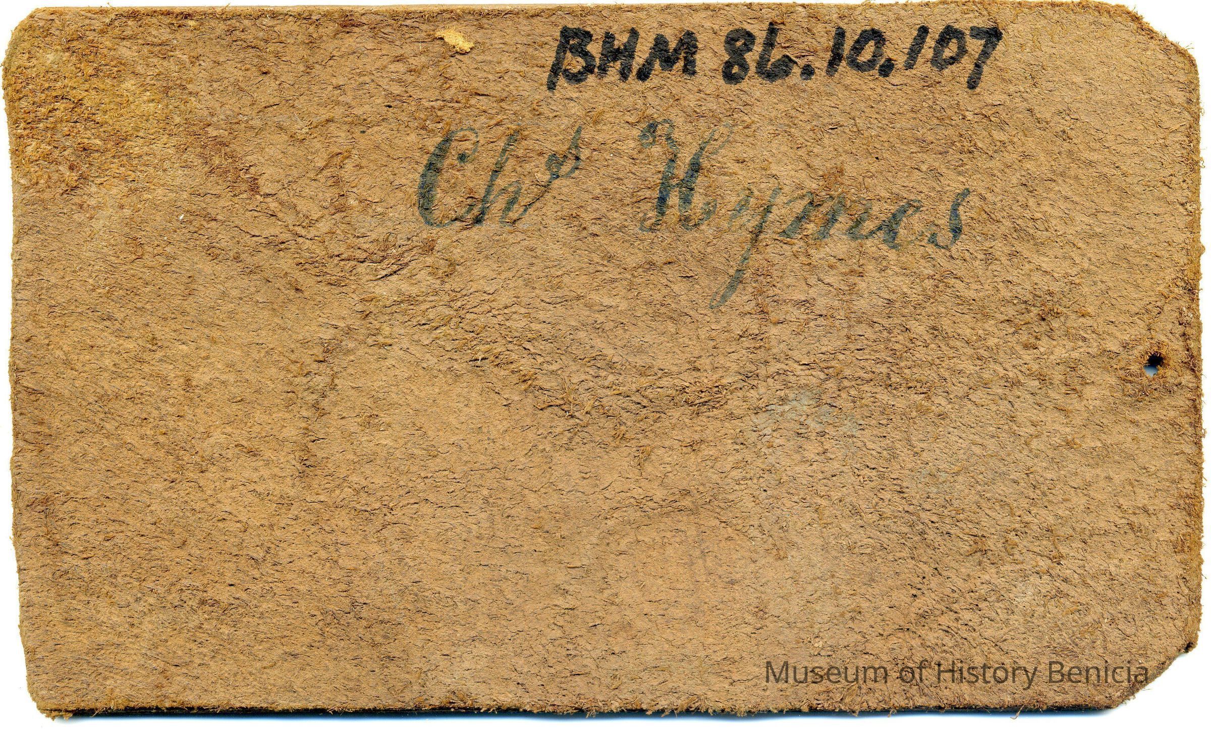 No copy of the original recording is adhered to the back of the leather, however some information is written on the front in ink. The brand is "C H" and placed on the left hip.